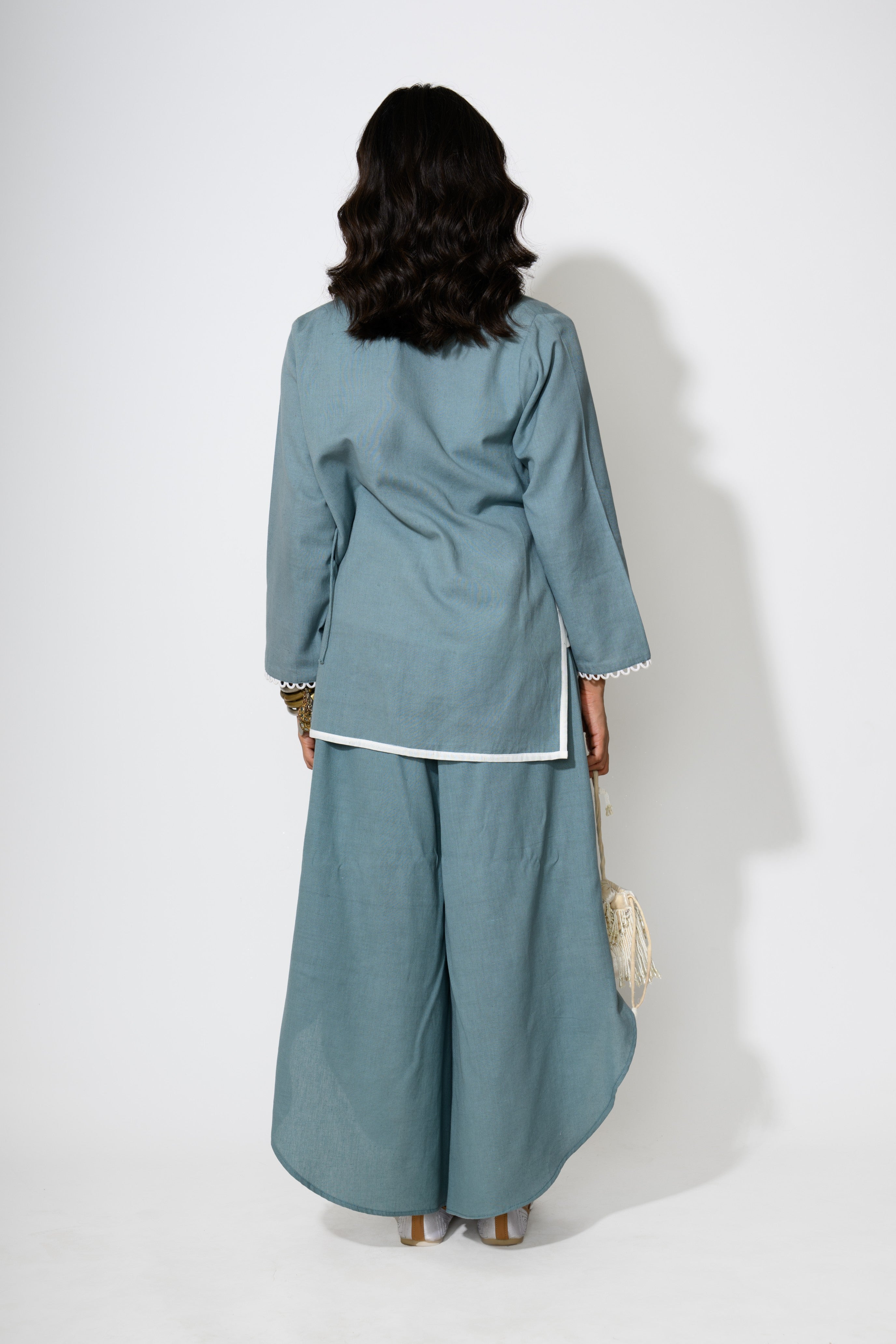 A serene co-ord set in a soft dusty blue hue, featuring a relaxed straight-cut kurta with full sleeves and scalloped detailing on the cuffs. The defining element is the attached draped layer that cascades from the neckline, edged with a contrasting white trim for a structured finish. Paired with flowy, wide-leg trousers that create an easy silhouette, this ensemble strikes the perfect balance between elegance and effortlessness. Ideal for daytime sophistication or breezy evening affairs.