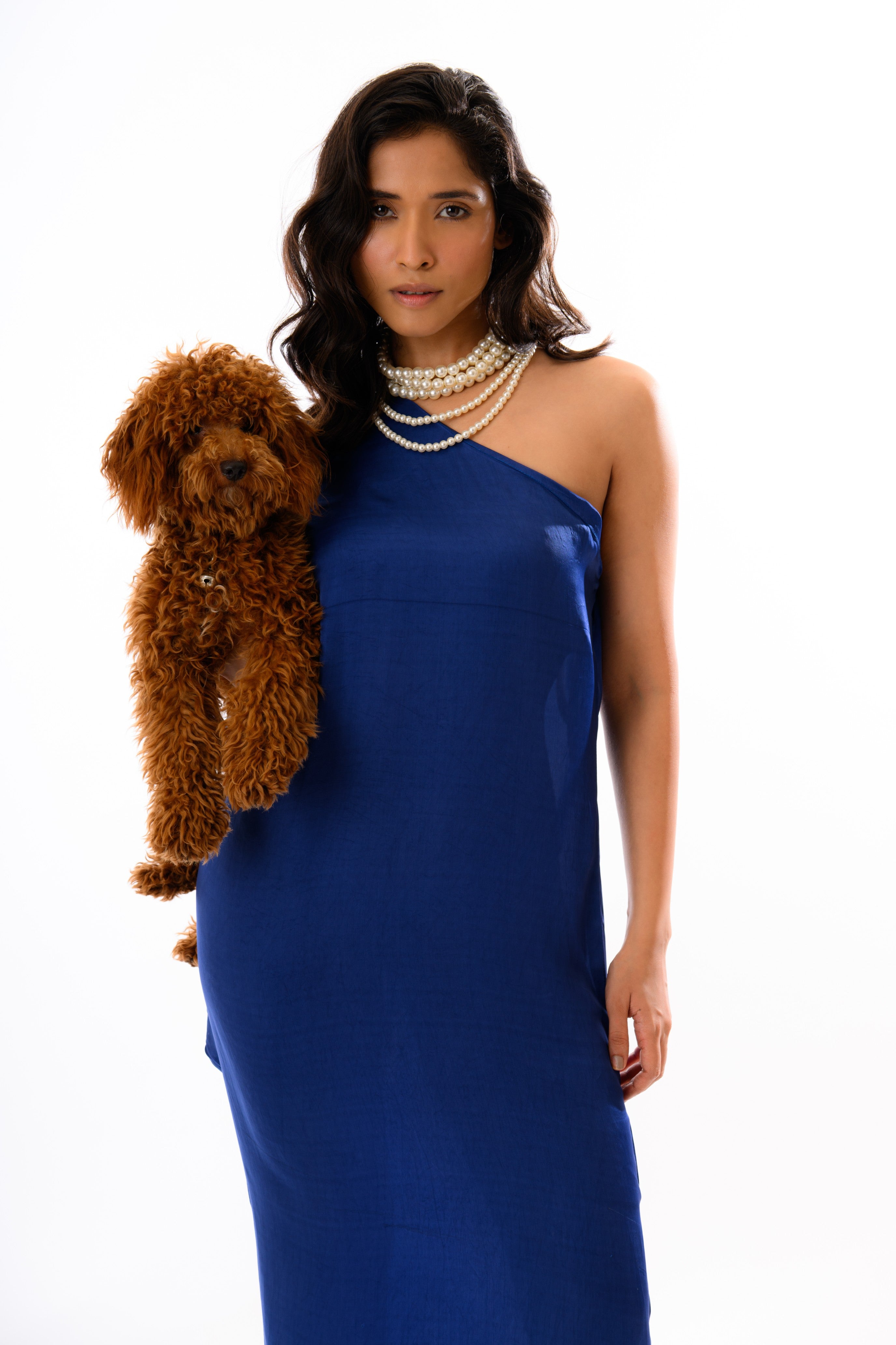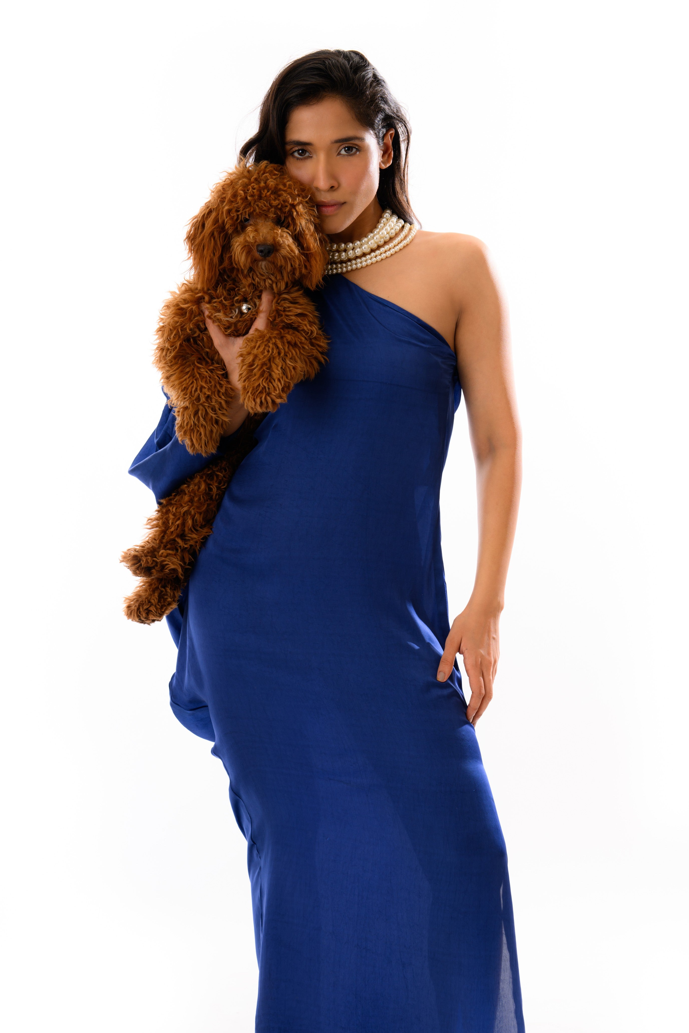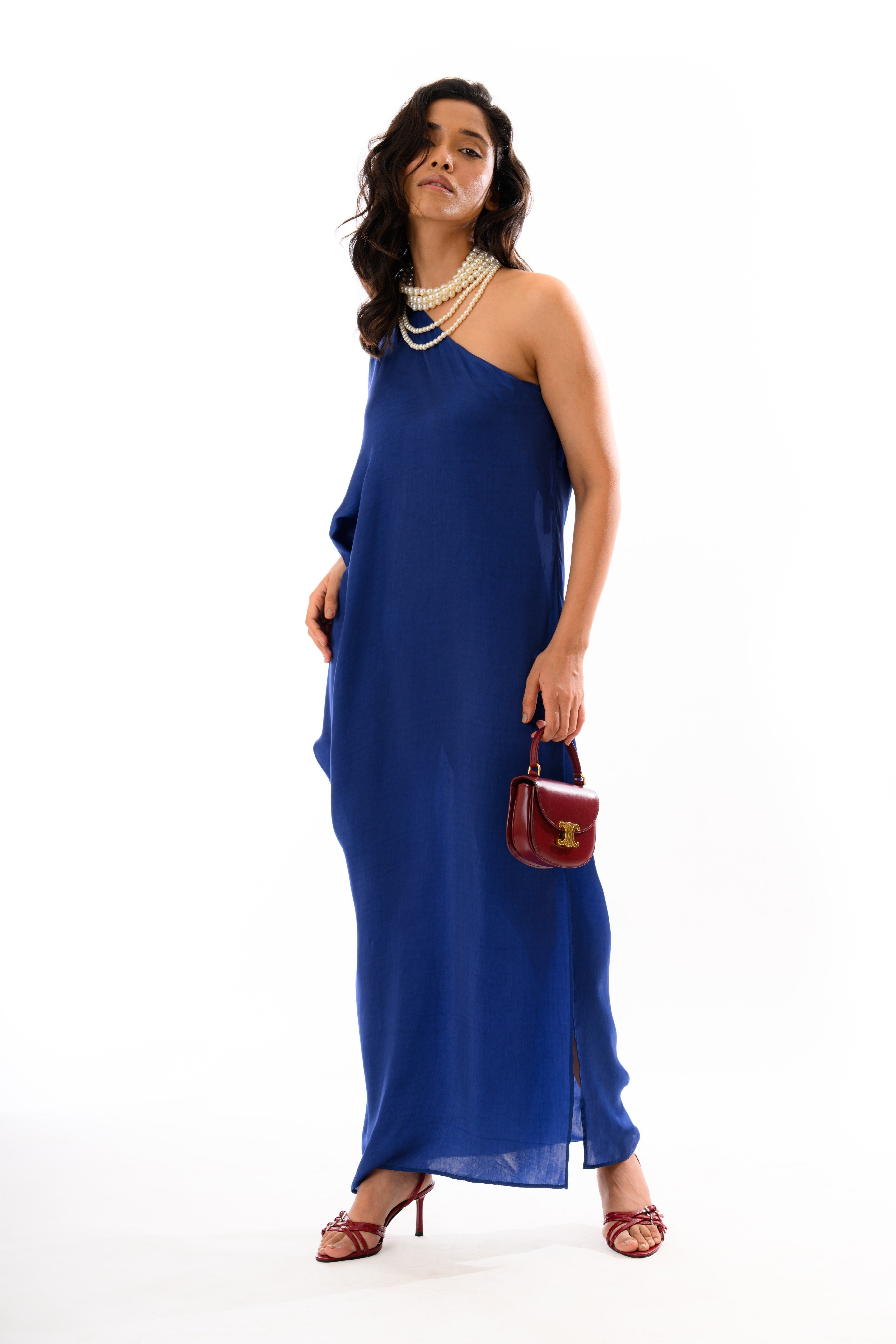 Elevate your evening ensemble with the Blue Solstice, a statement piece designed for effortless sophistication. Crafted from a fluid, lightweight fabric in a rich royal blue hue, features an asymmetrical one-shoulder neckline that exudes modern elegance. The relaxed, draped silhouette skims the body gracefully, while a daring thigh-high slit adds a bold, feminine edge.