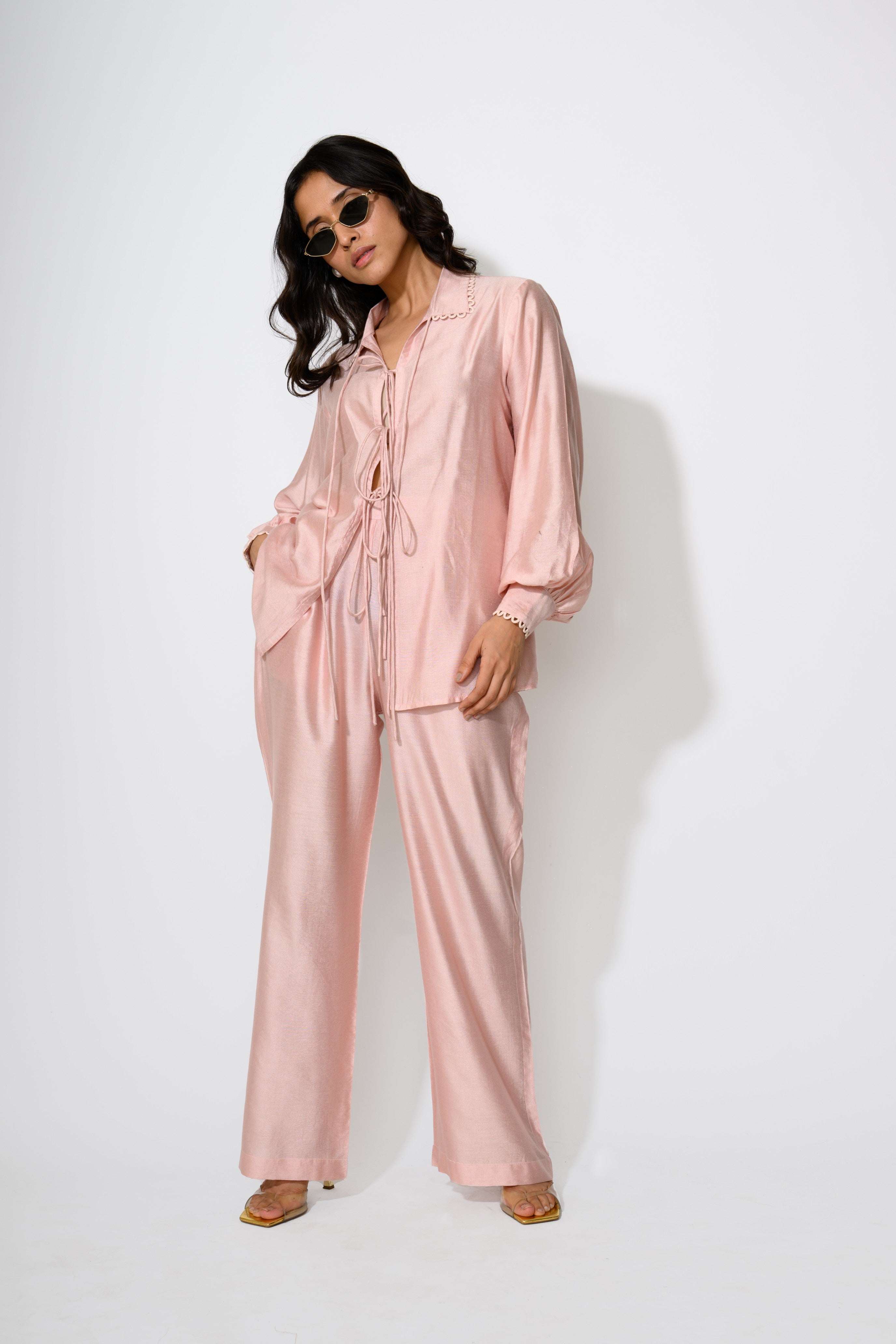 Meet your new go-to: the Blush Hour co-ord set in dreamy cotton silk. With its soft rose sheen and playful tie-up shirt, this set blends elegance with a hint of flirt. Perfect for brunch dates or lounging in style—because who says comfort can’t be chic