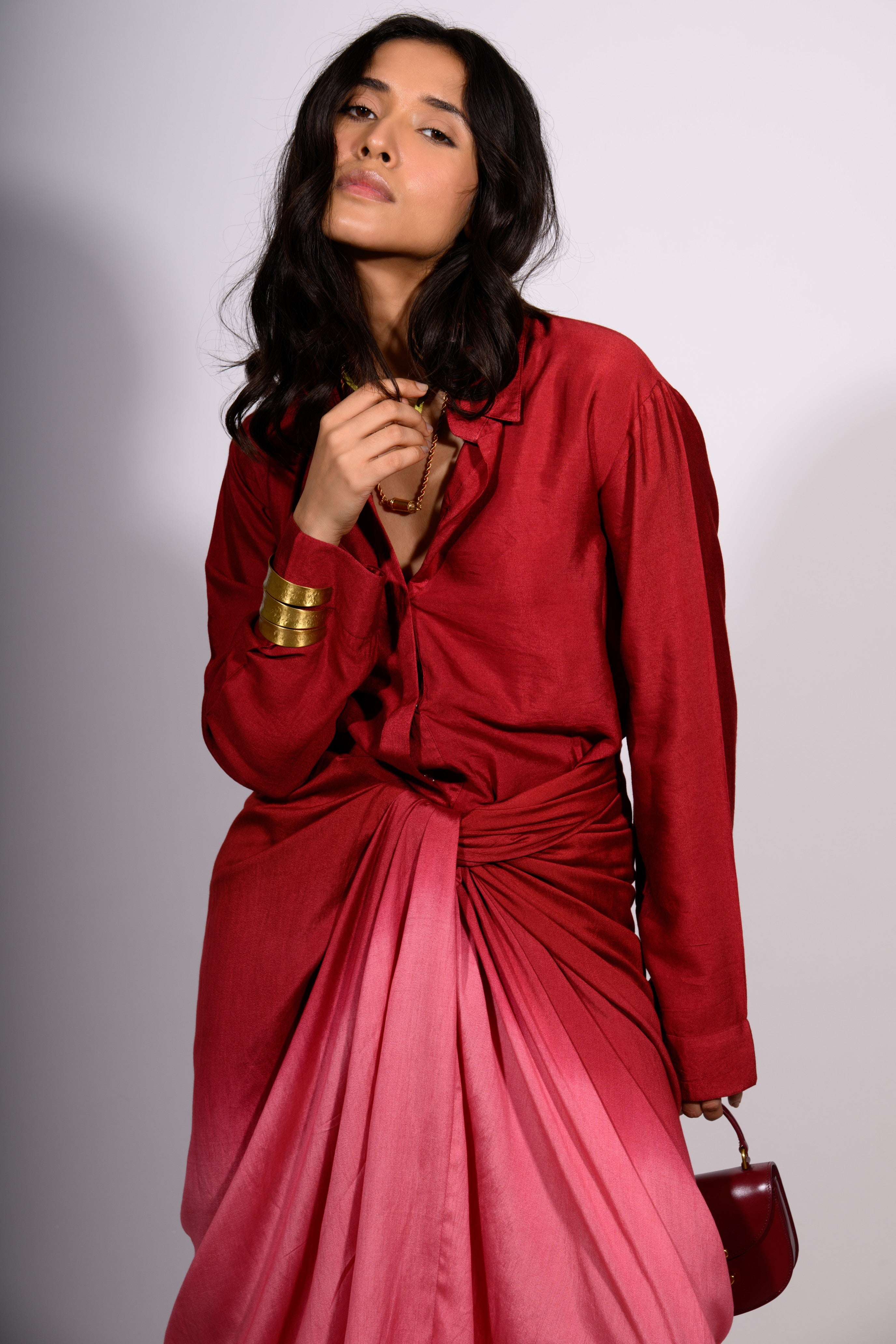 A striking fusion of structure and flow, Rouge Ruché features a deep red shirt-style top paired with an artfully draped, ombré silk skirt in shades of crimson and rose. The skirt cascades with soft gathers that mimic a sari-like silhouette.The look blends power and elegance, ideal for evening affairs or modern festive occasions.