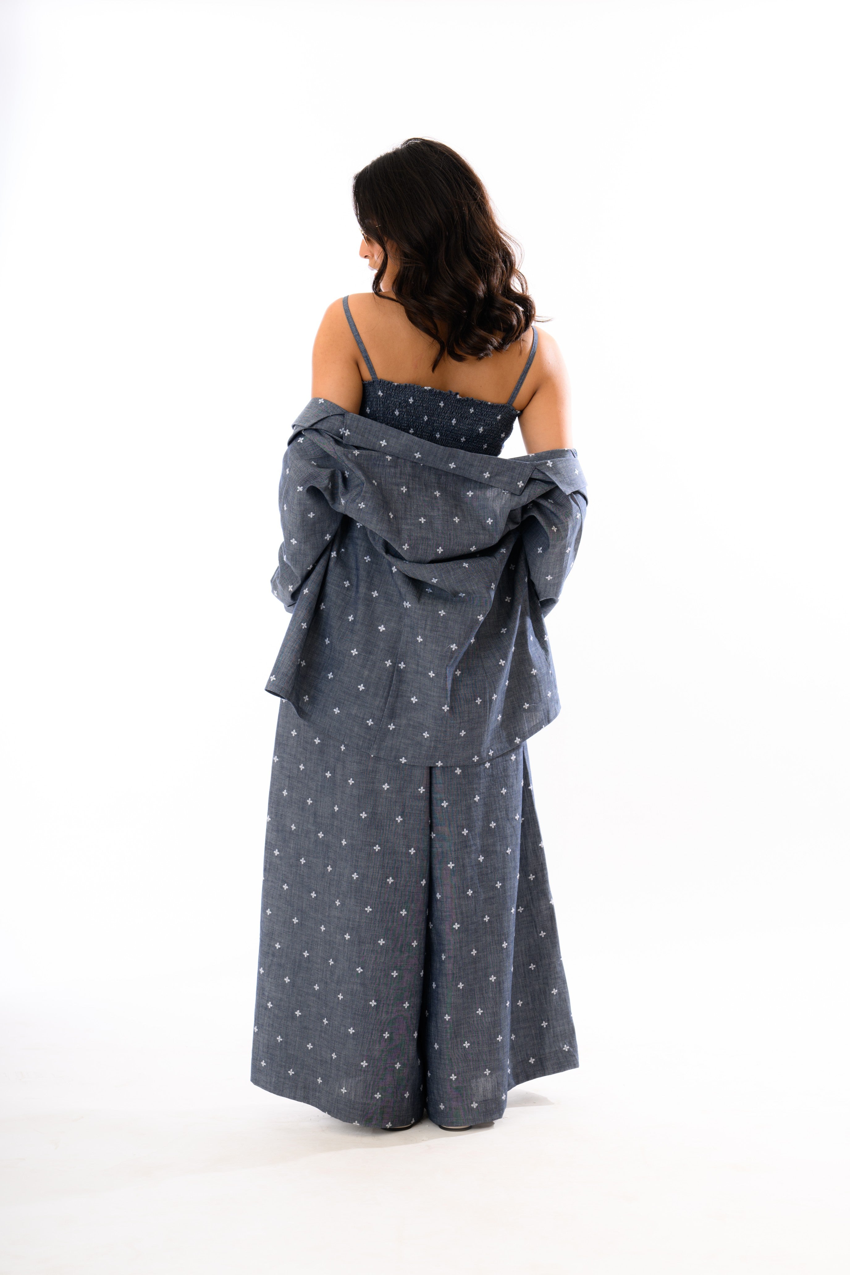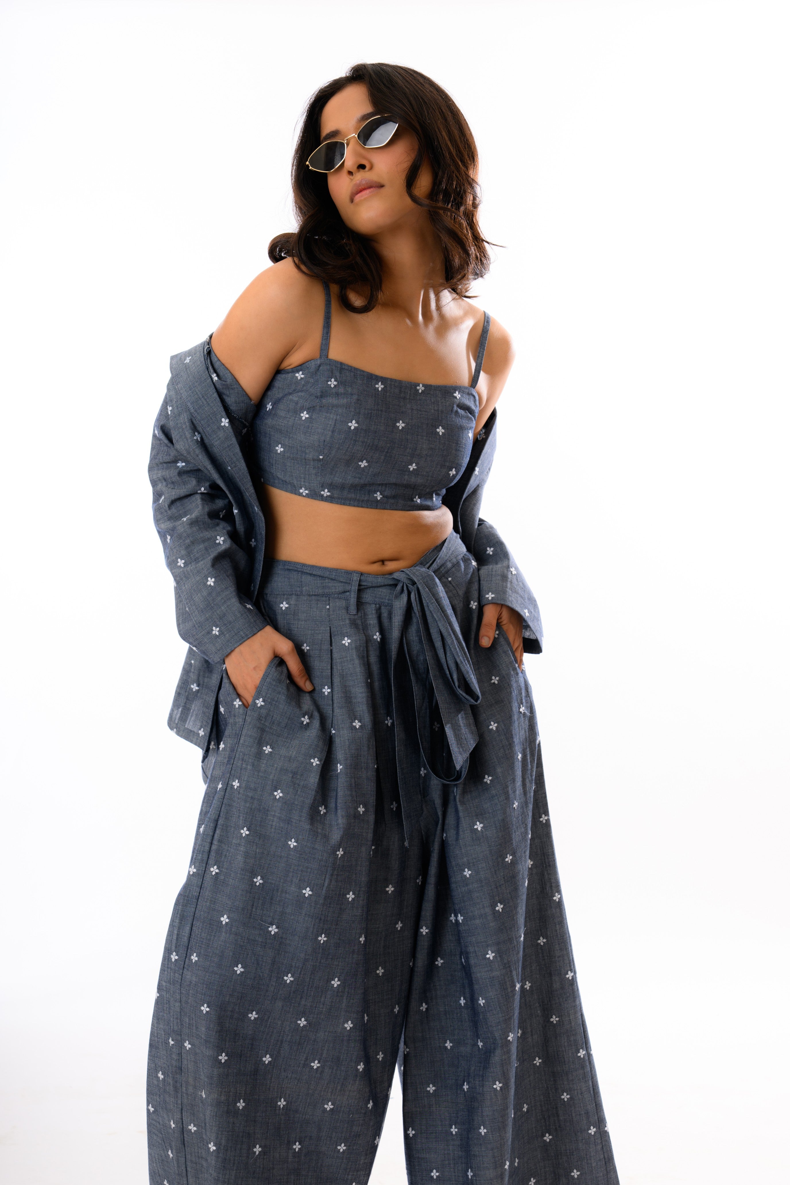 This three-piece denim-inspired co-ord set features a lightweight chambray fabric detailed with delicate white embroidered motifs, blending ease with structure. The ensemble includes: