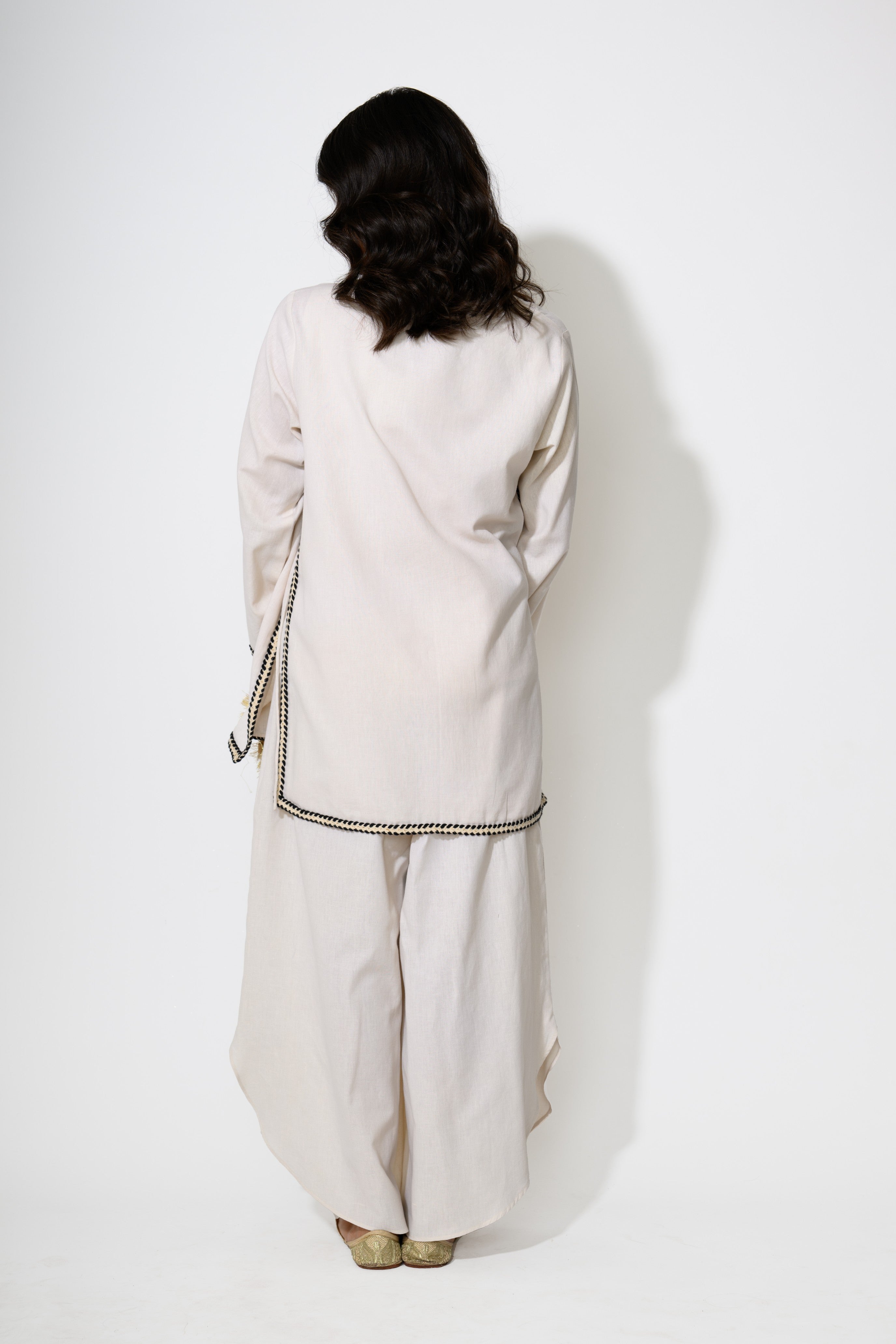 Understated elegance meets artisanal charm in this two-piece ivory ensemble. The set features a relaxed-fit tunic with a softly draped cowl neckline, elevated by black handcrafted braided trim that delicately outlines the edges and sleeves. Paired with wide-legged trousers in matching fabric, the outfit offers effortless movement and sophistication. Perfect for brunches, festive gatherings, or elevated casual wear, this versatile co-ord is a celebration of comfort with a refined edge.