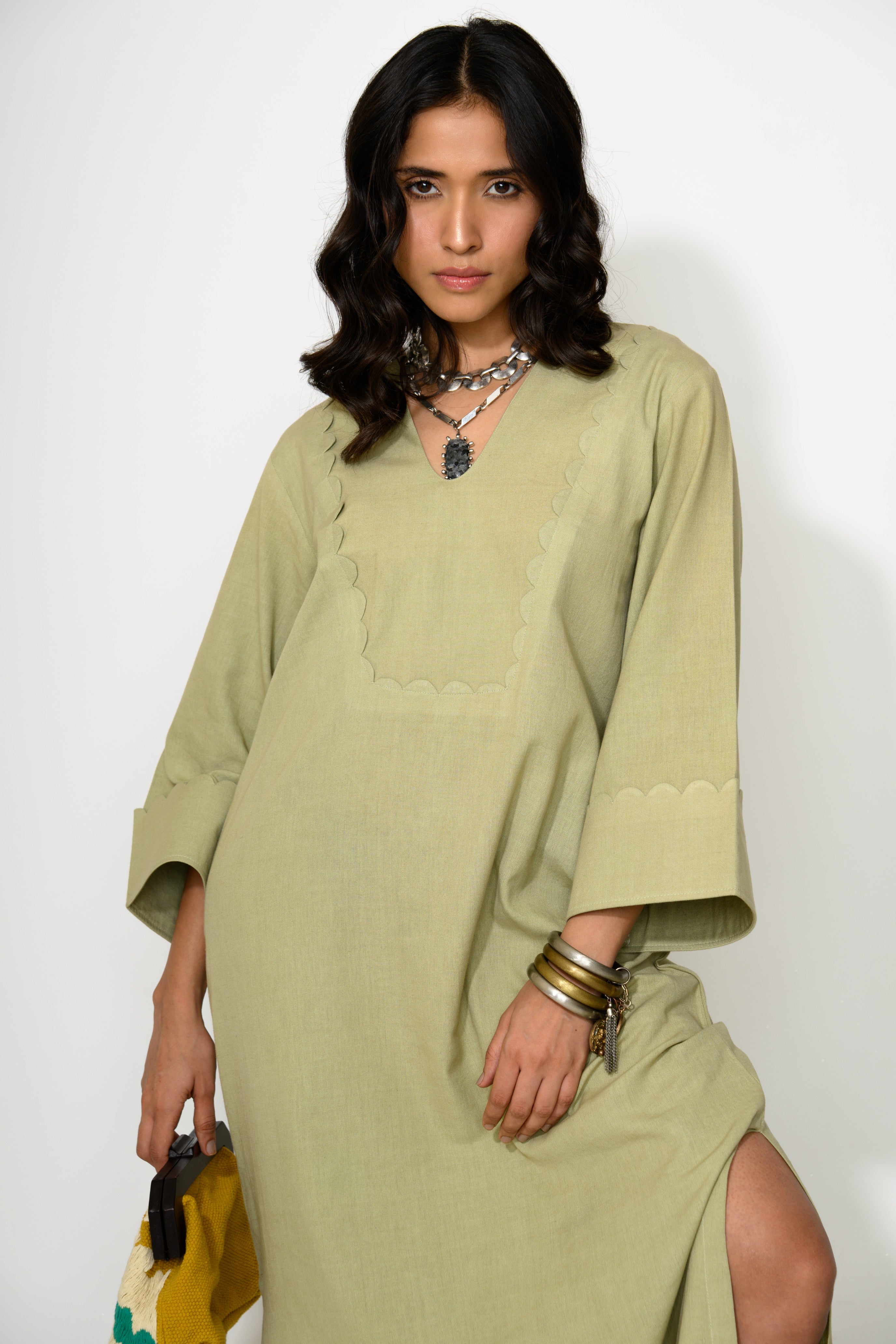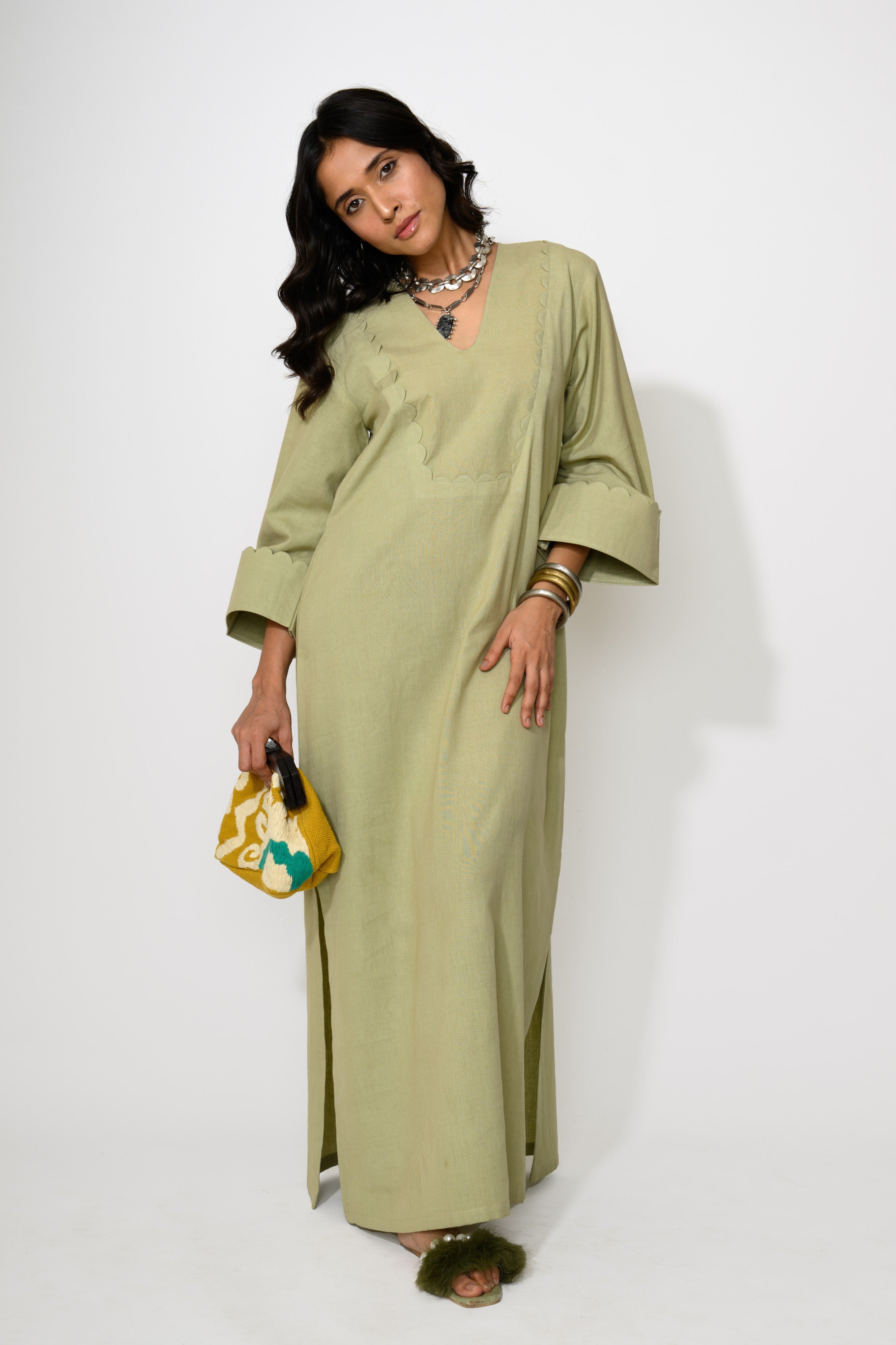 Float through your day in this breezy Mint Muse coord set, crafted from luxurious cotton linen. The top features a relaxed silhouette with subtle scallop detailing along the neckline and sleeves, adding a whisper of charm to your look. Paired with farsi salwar in true Pakistani style, this outfit blends tradition with contemporary grace—effortless, elegant, and endlessly wearable.