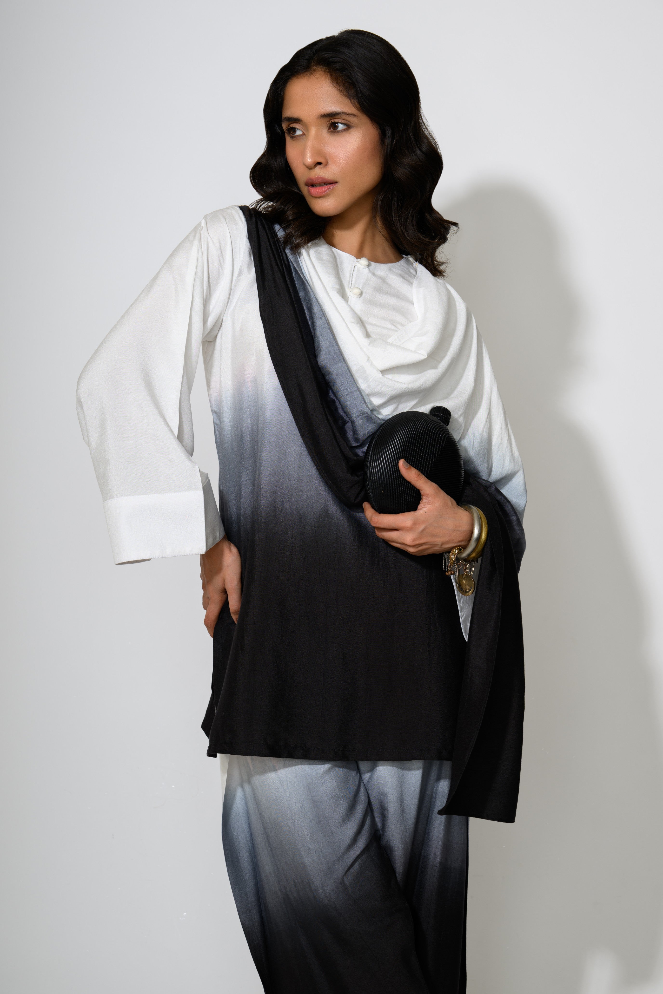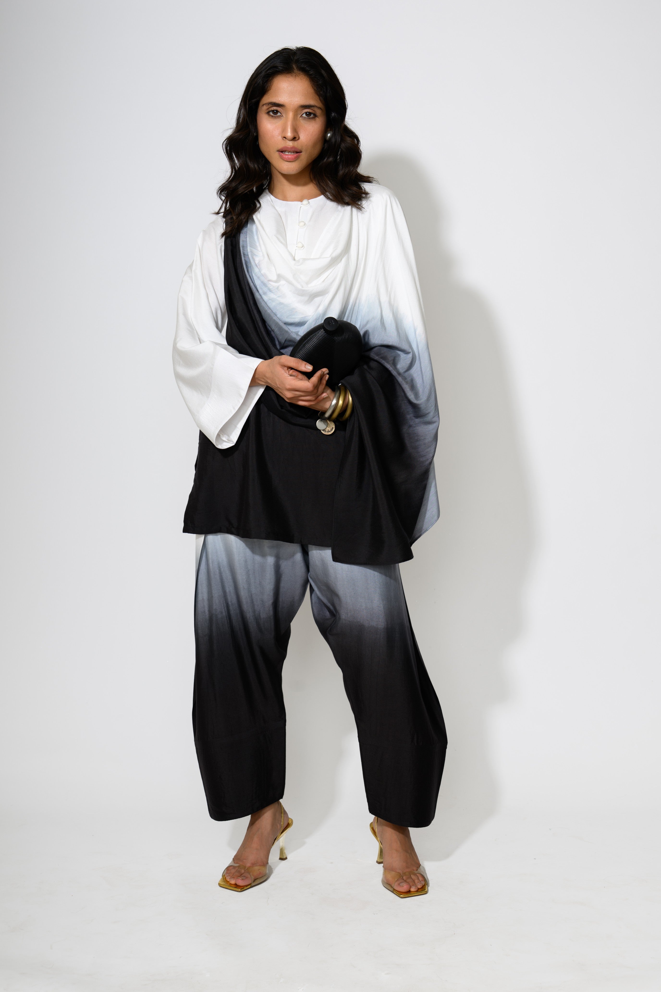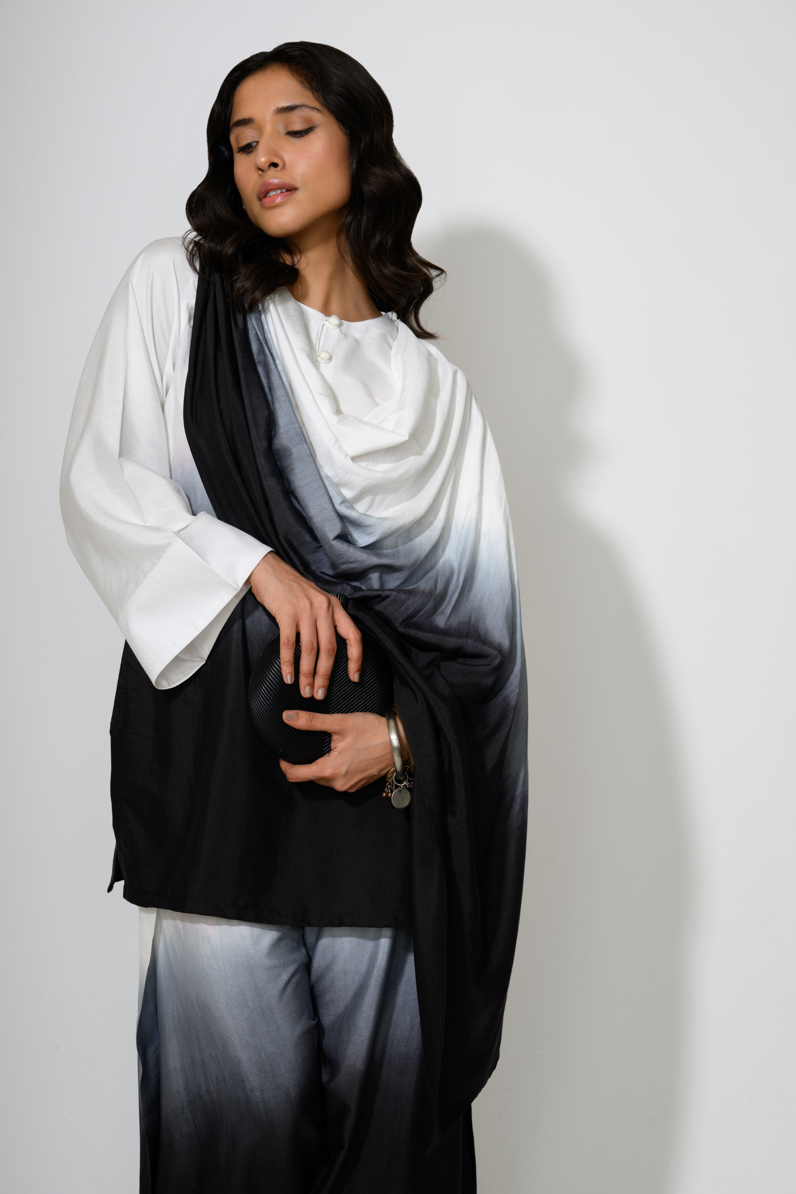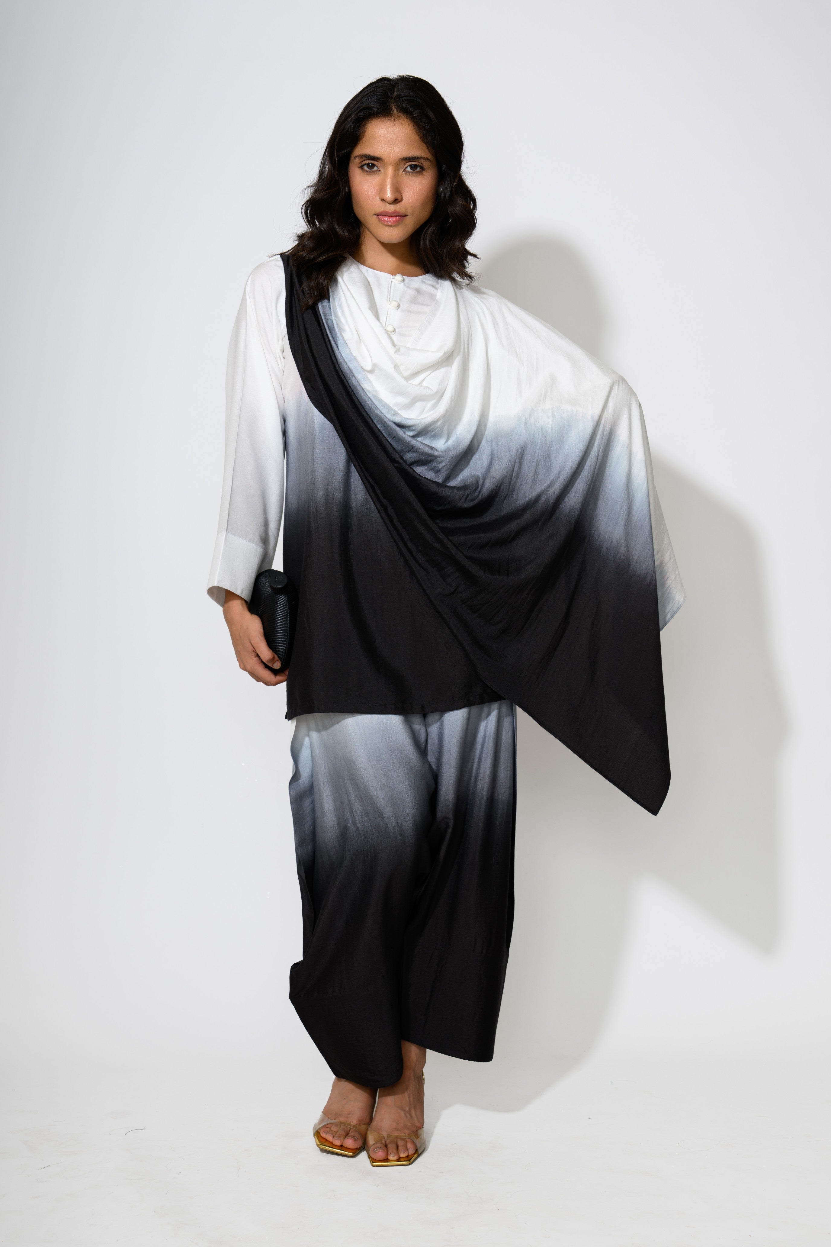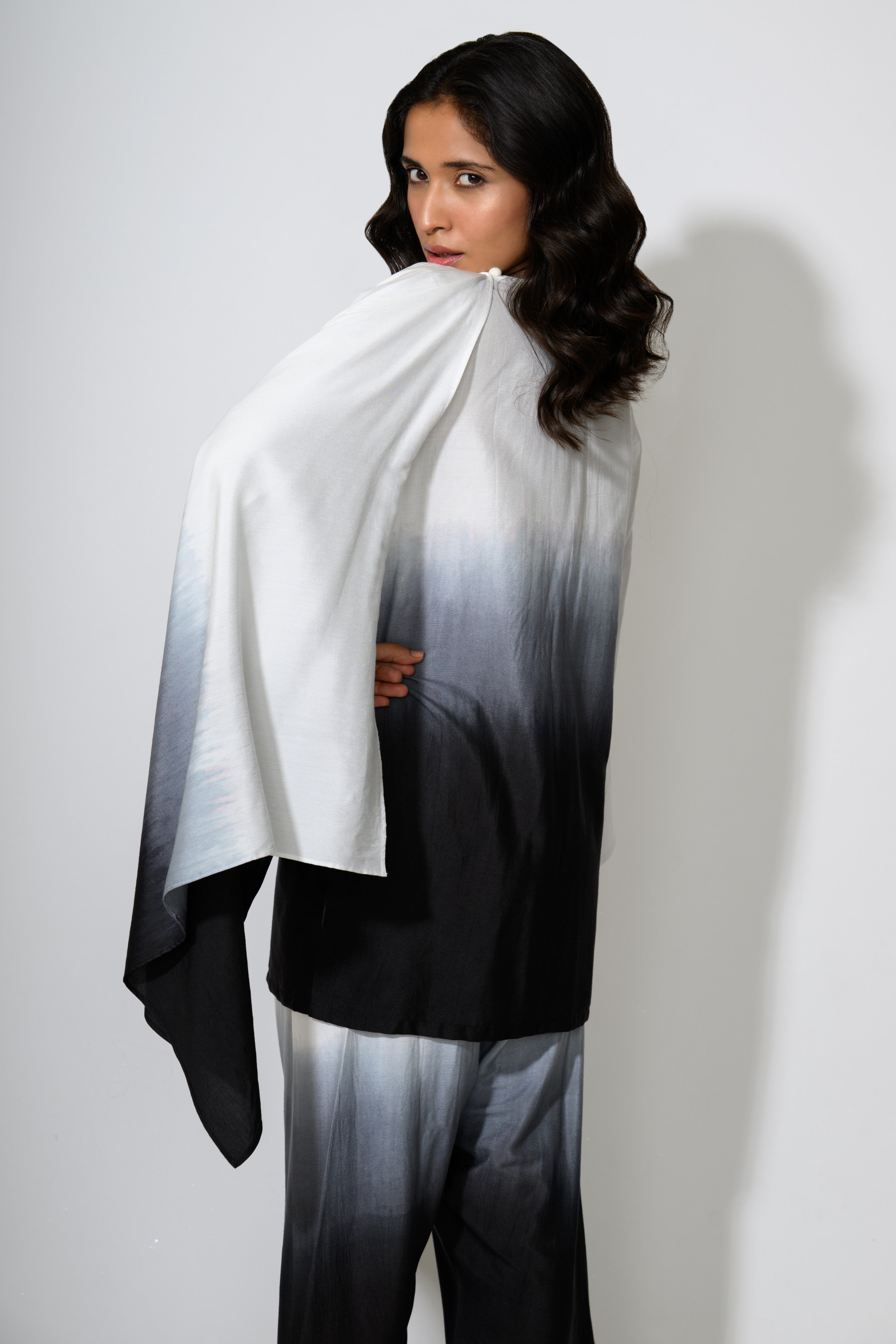 An Indo-Western ombré co-ord set featuring a relaxed, high-low kurta with a fluid drape detail cascading from the shoulder. The top transitions from crisp white into rich black through a gradient wash of grey, paired with matching wide-legged trousers echoing the same dip-dyed effect. The silhouette blends comfort with statement design, ideal for effortless styling.