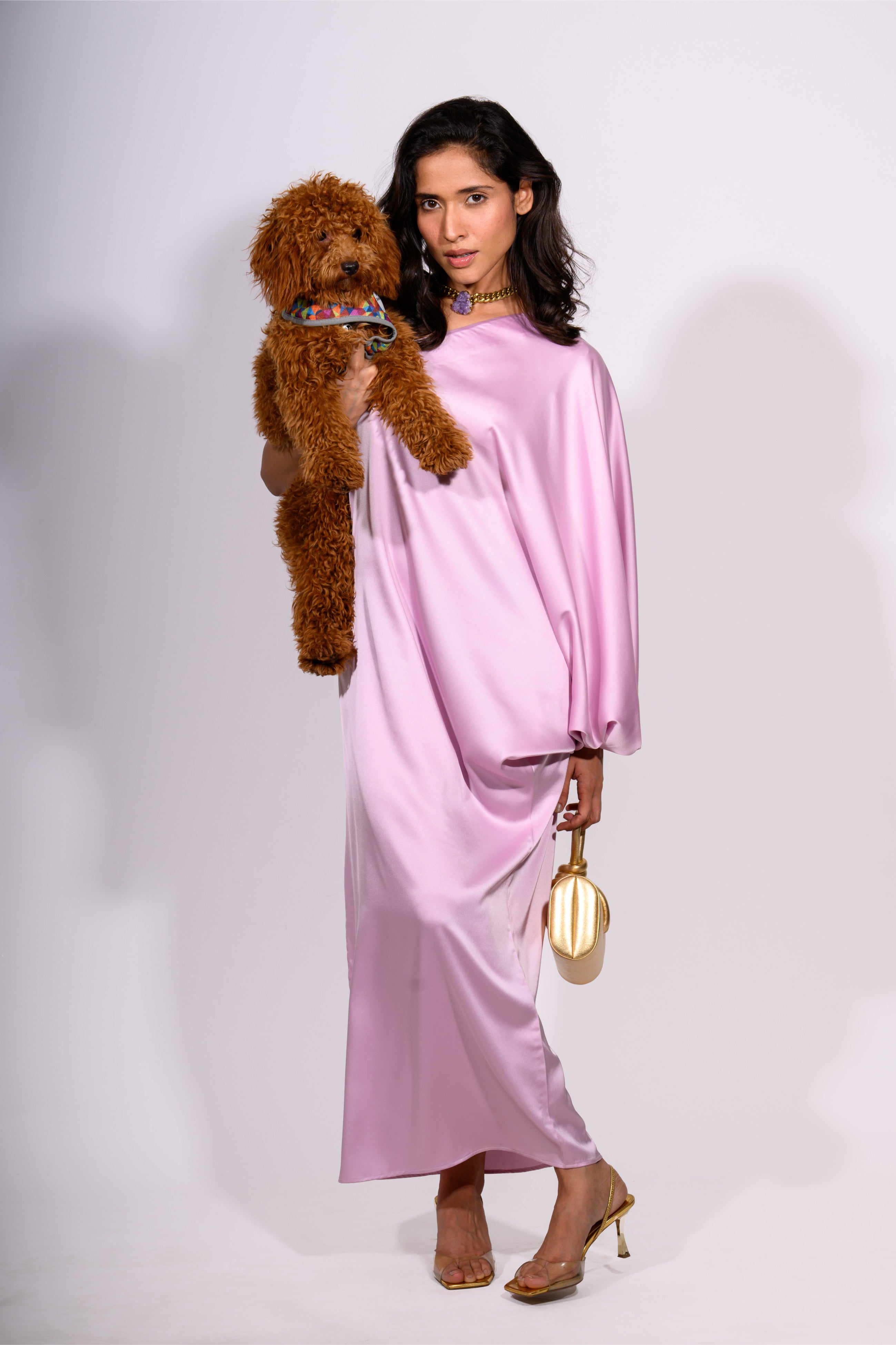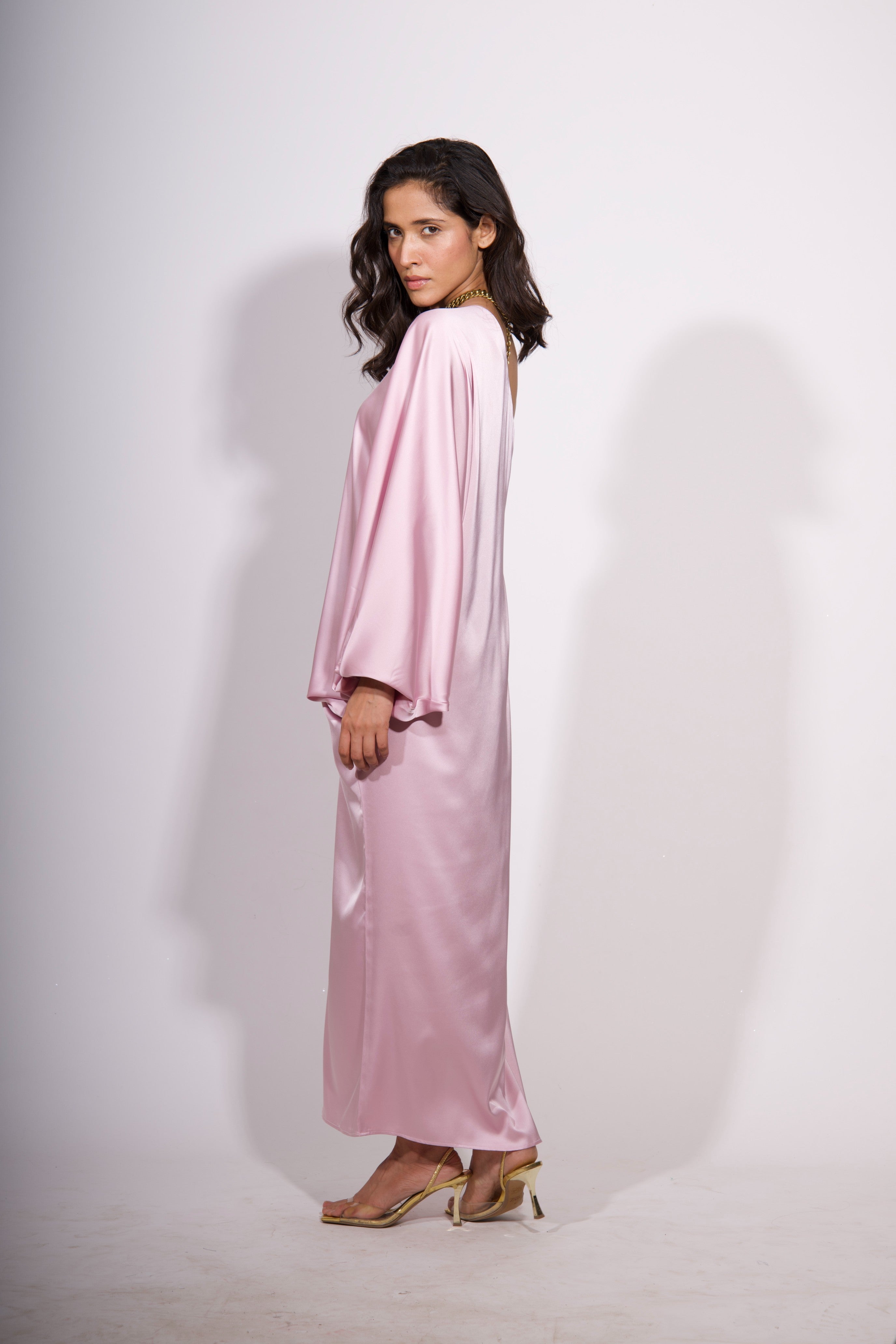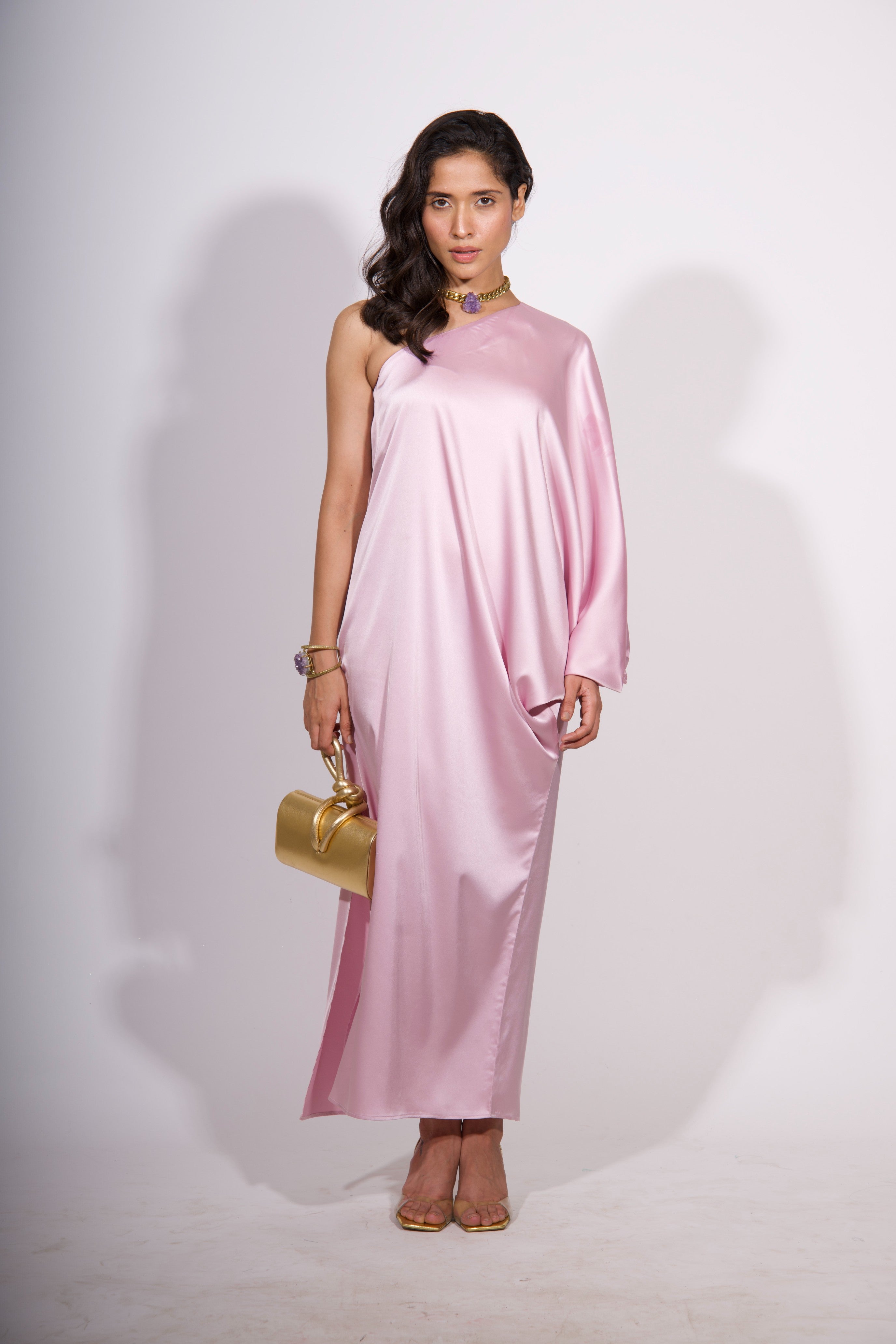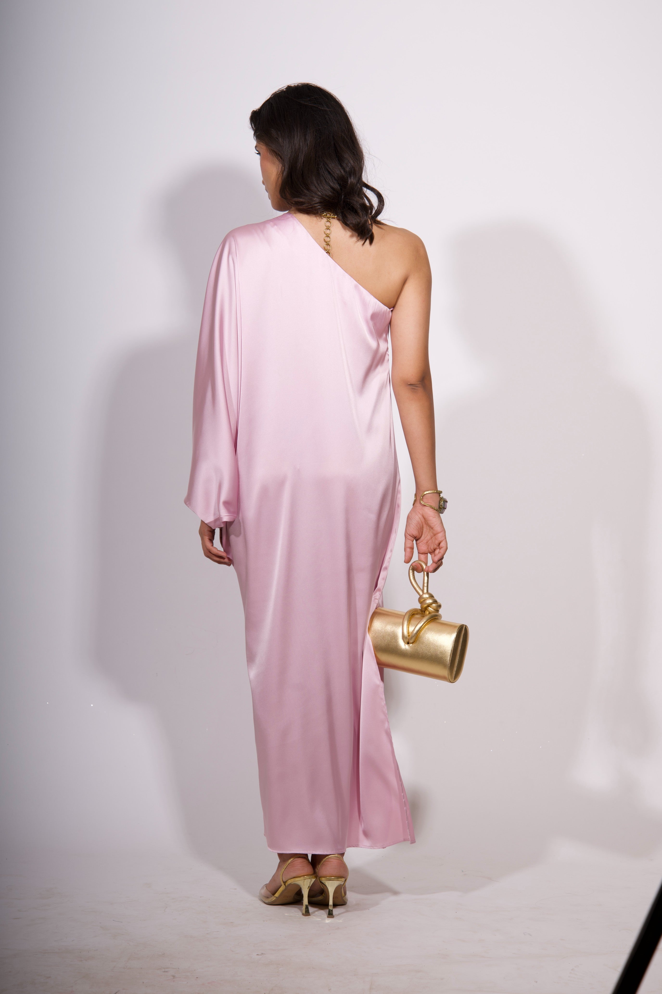 A vision of understated glamour, the Rosé Aura One-Shoulder Dress is crafted from sumptuous Armani satin in a delicate blush pink. This fluid, asymmetric silhouette drapes beautifully over the body, offering a modern, sculptural take on eveningwear. The one-shoulder neckline adds a touch of allure, while the gathered side detail creates soft movement and dimension. A thigh-high slit adds subtle drama, perfect for special occasions. Pair with a statement clutch and bold jewelry to complete the effortlessly chic look.