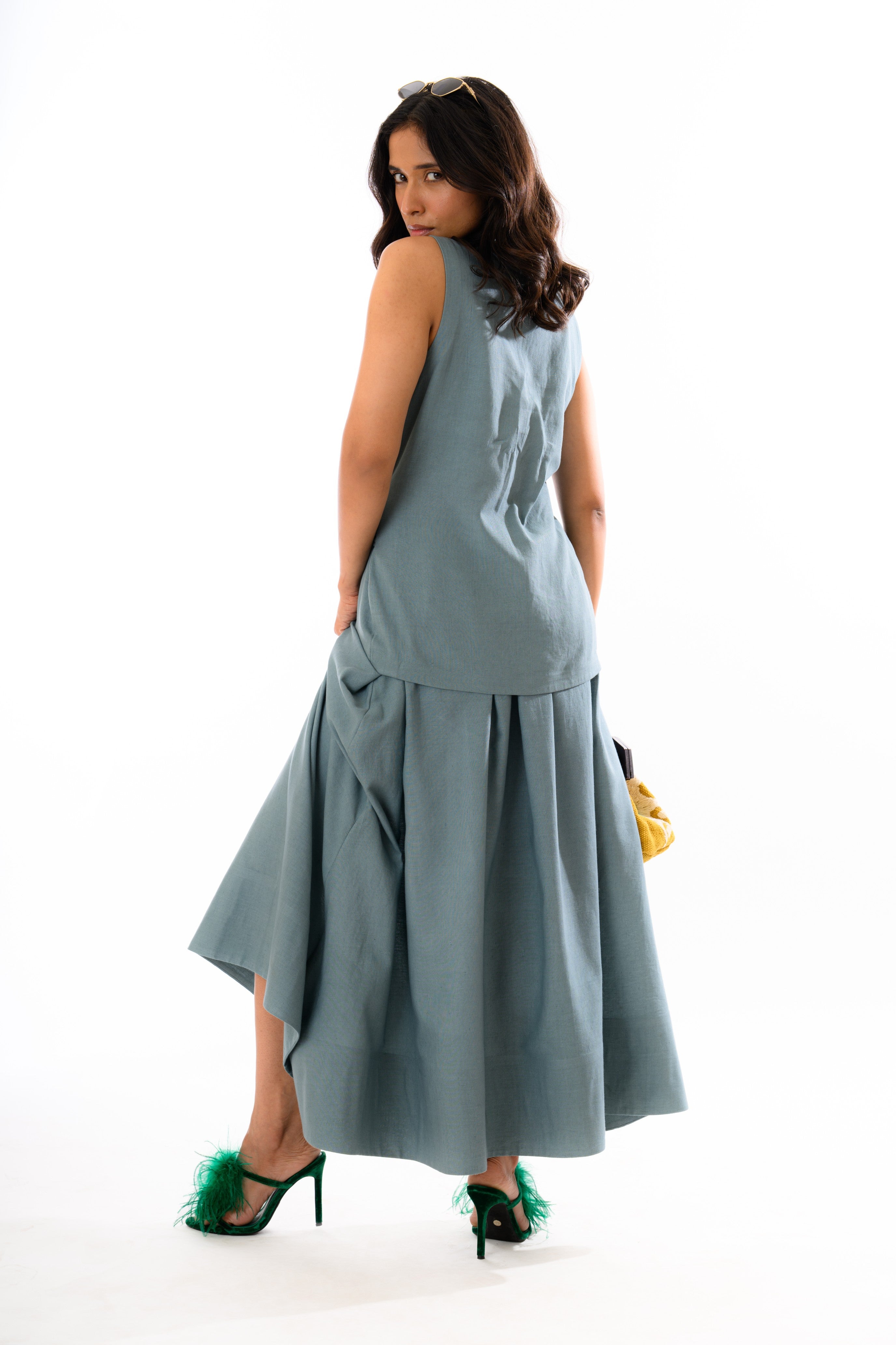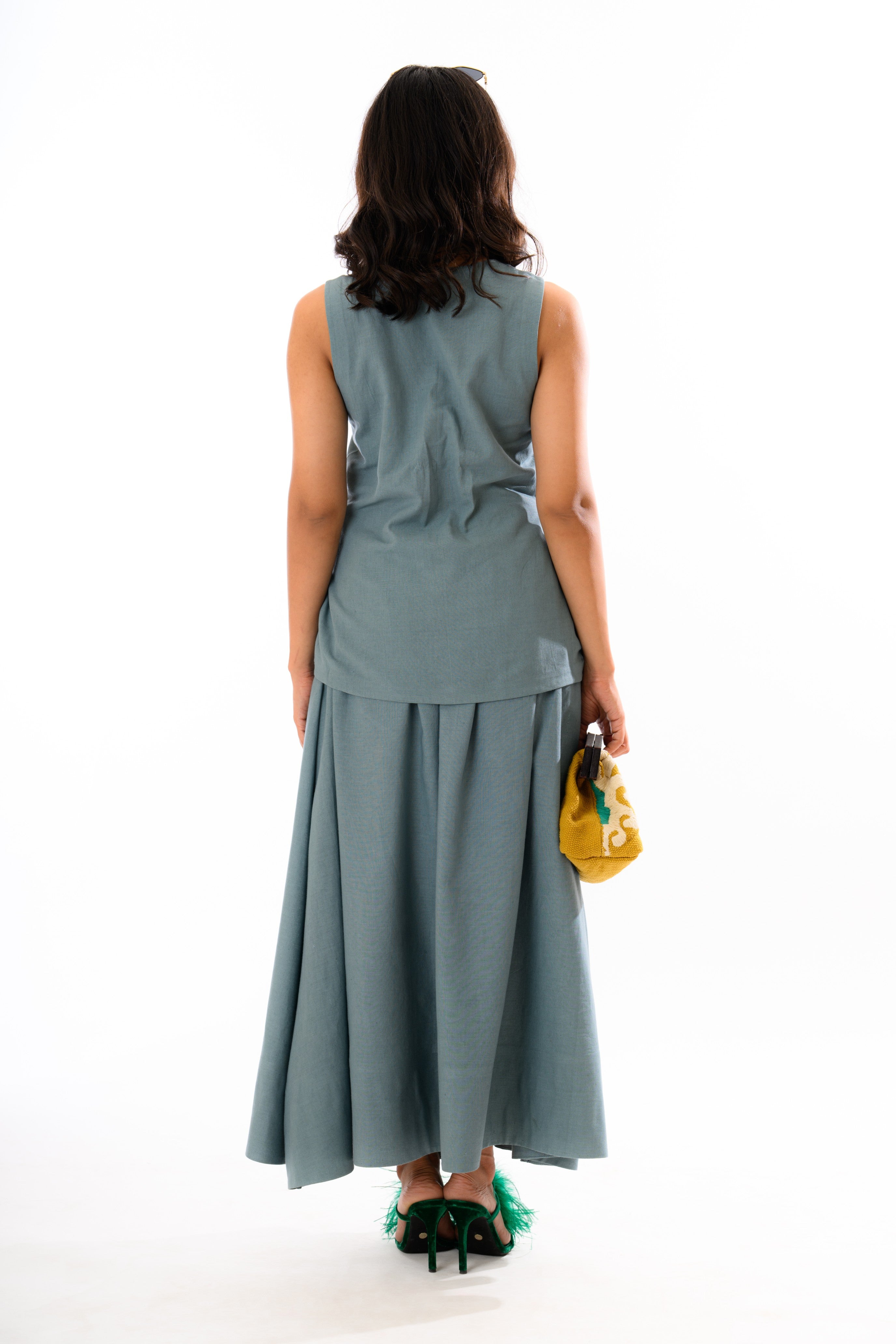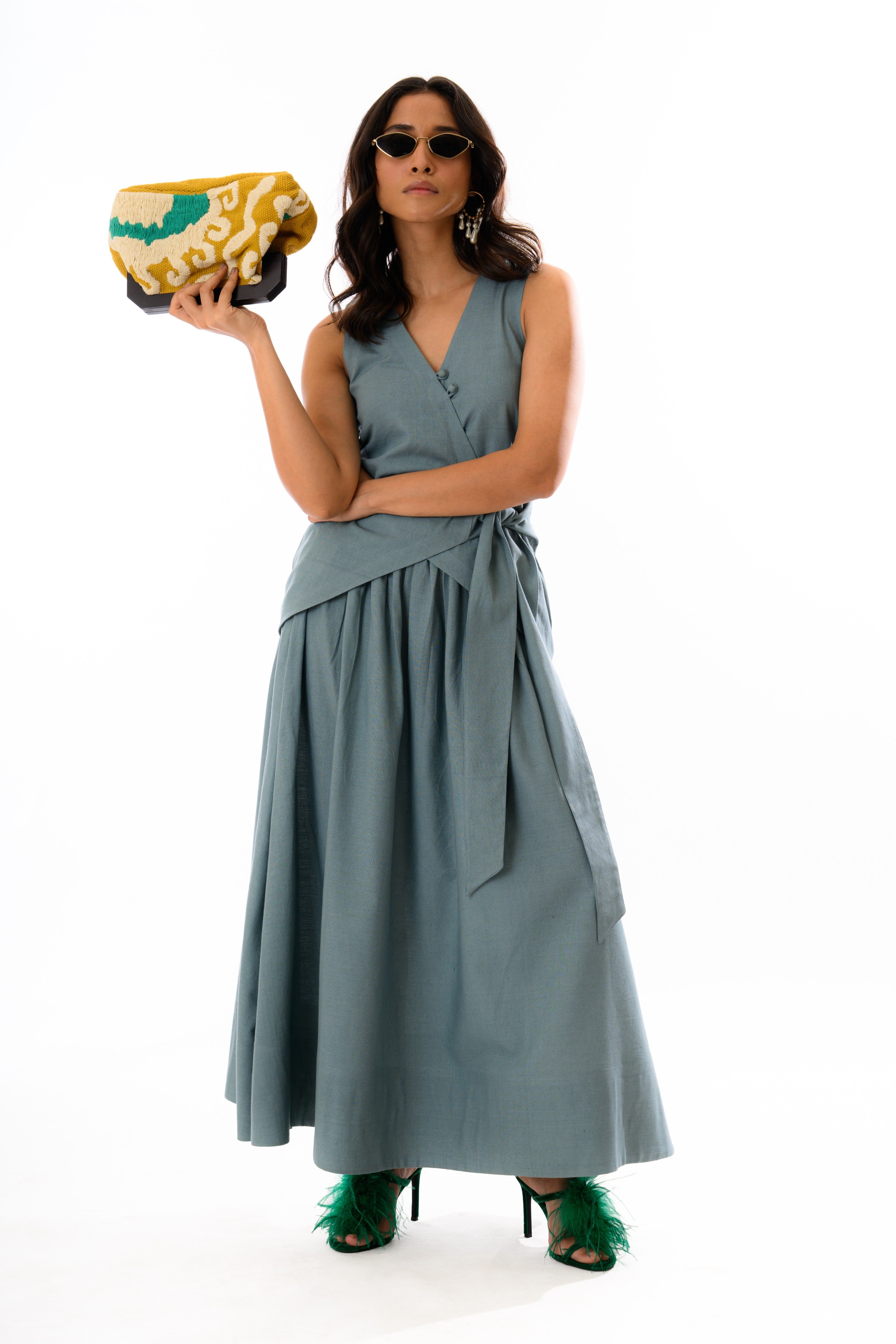 The Sage Whisper Co-ord Set is a contemporary ode to relaxed elegance. This two-piece ensemble features a sleeveless, V-neck wrap top with a side tie detail that cinches the waist gracefully, paired with a voluminous, high-waisted skirt that drapes with soft gathers for movement and flair.