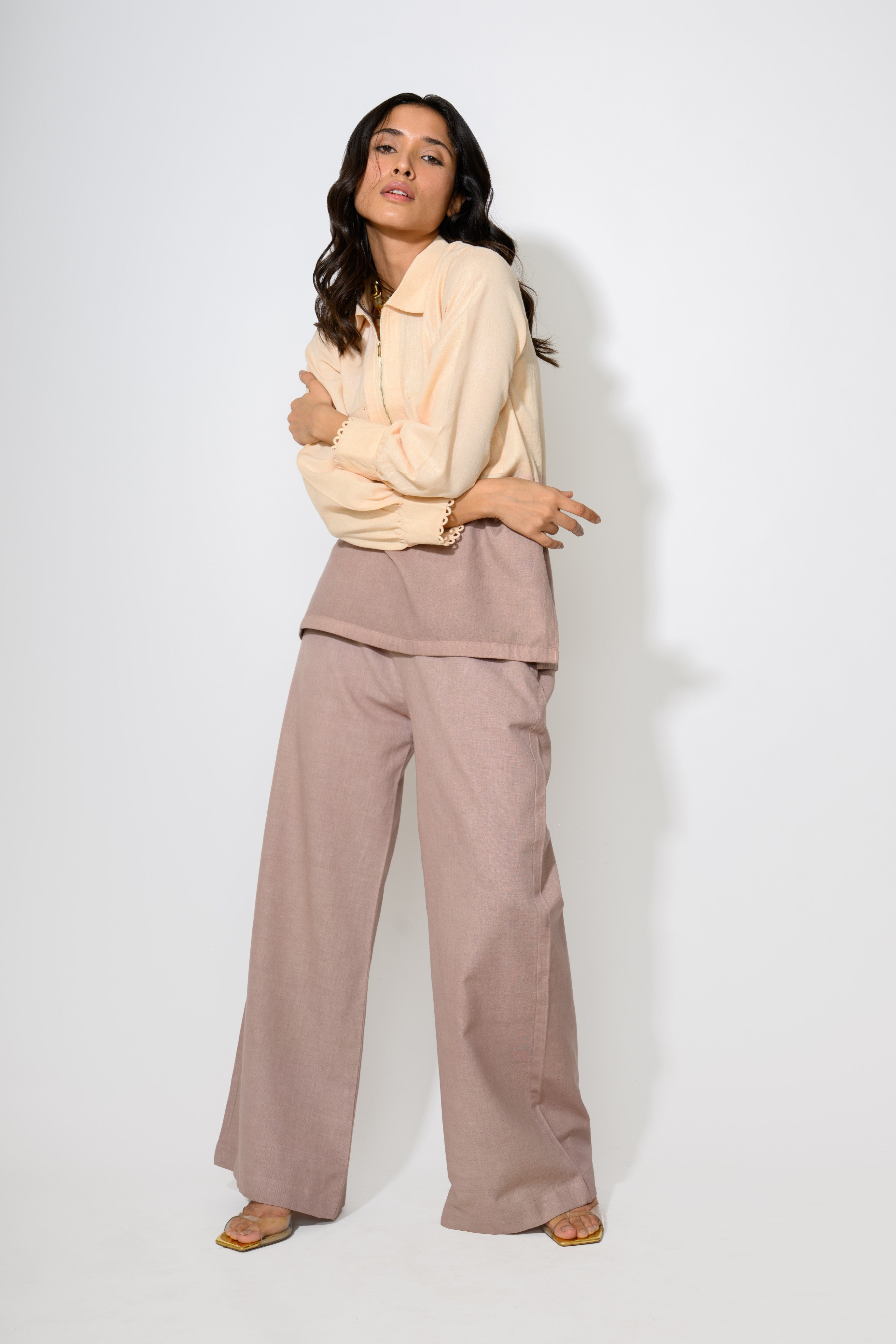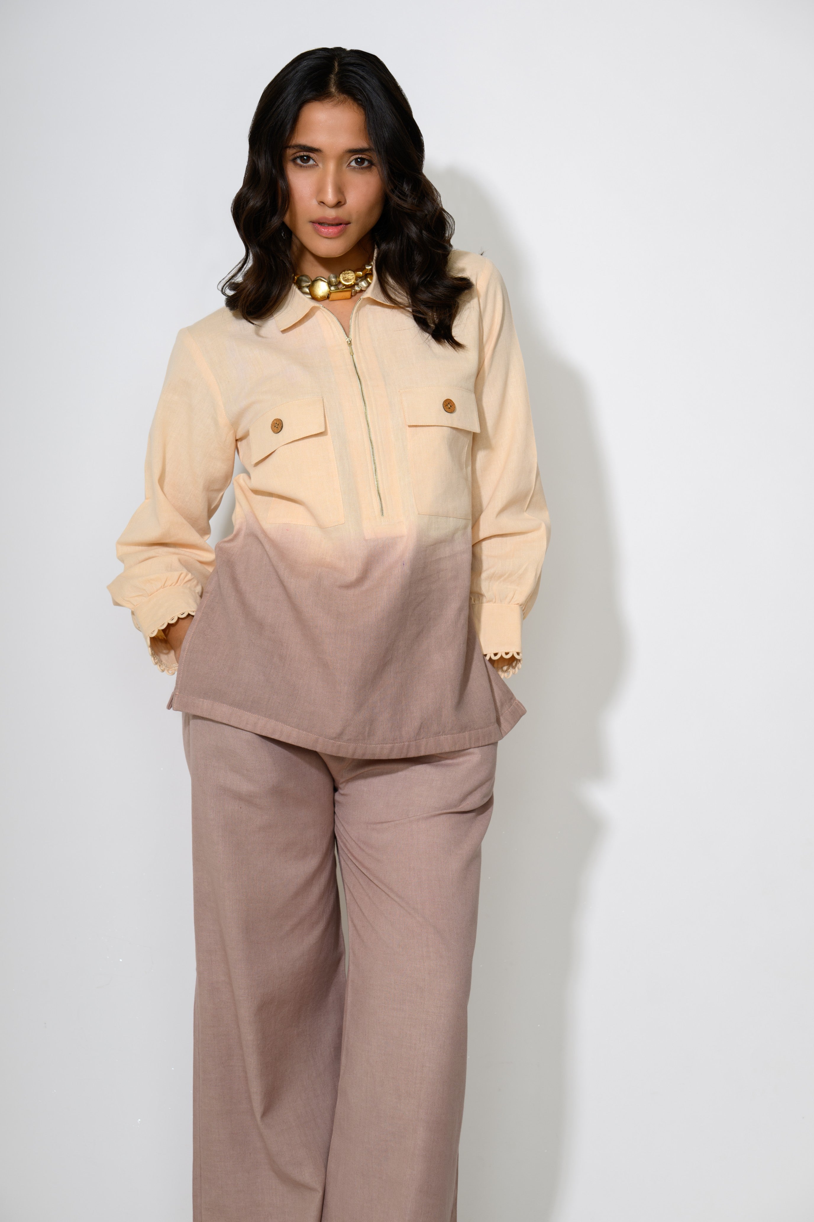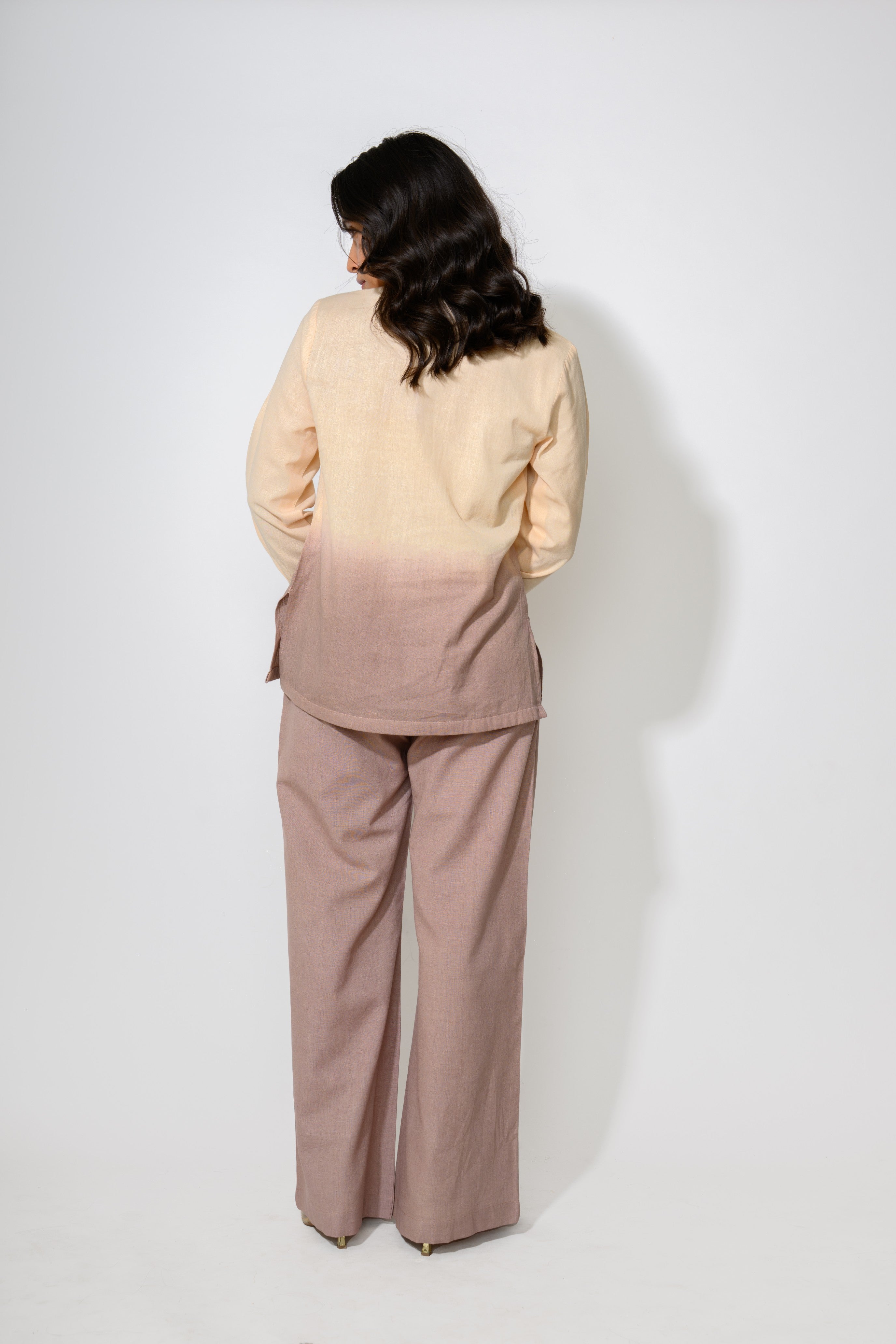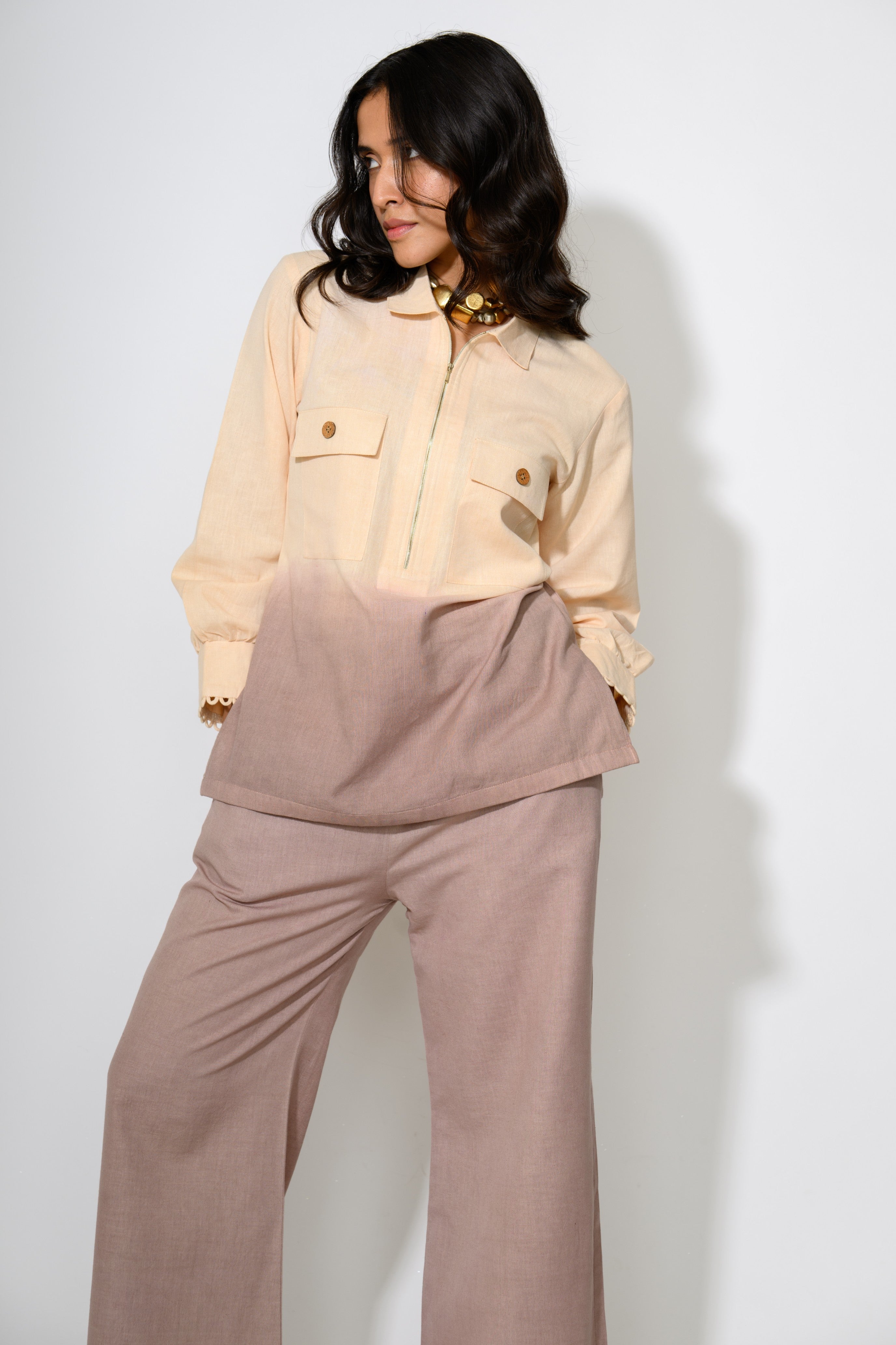 The Sand Dune Dip Set is where earthy tones meet playful design. This ombré-dyed linen co-ord is a soft sunset in clothing form — starting with a sandy beige and melting into a warm taupe. The shirt features utility-style pockets and a zip-up front for an easygoing vibe, while the flowy pants bring the comfort. It’s desert cool, reimagined for city streets.