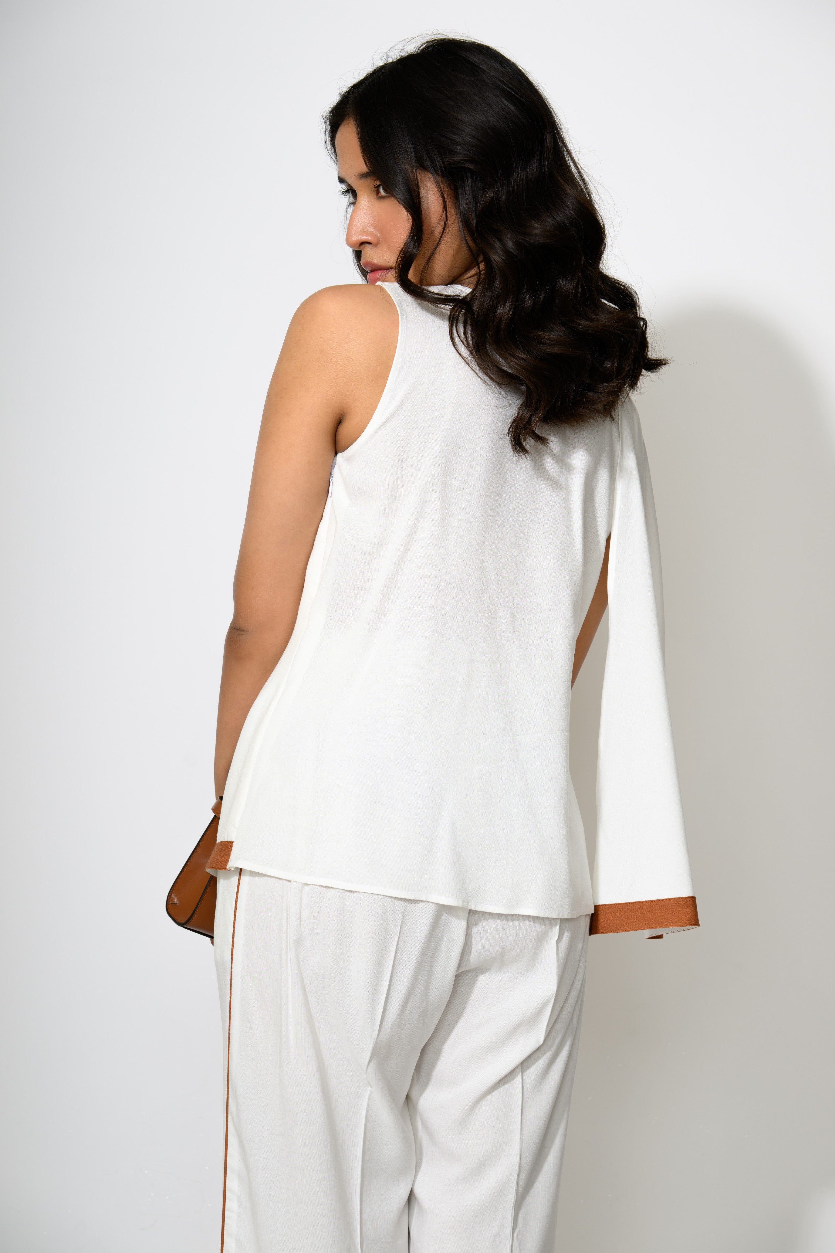 This chic two-piece set features a sleeveless asymmetrical white tunic top with structured shoulders and a distinctive cognac-brown trim that outlines the edges and flows down the sides for added movement. The matching white wide-leg trousers maintain a clean, tailored silhouette with the same cognac detailing running down the side seams, creating a harmonious and elongated look. The outfit is minimal yet statement-making, offering a perfect blend of modern tailoring and elegant contrast.