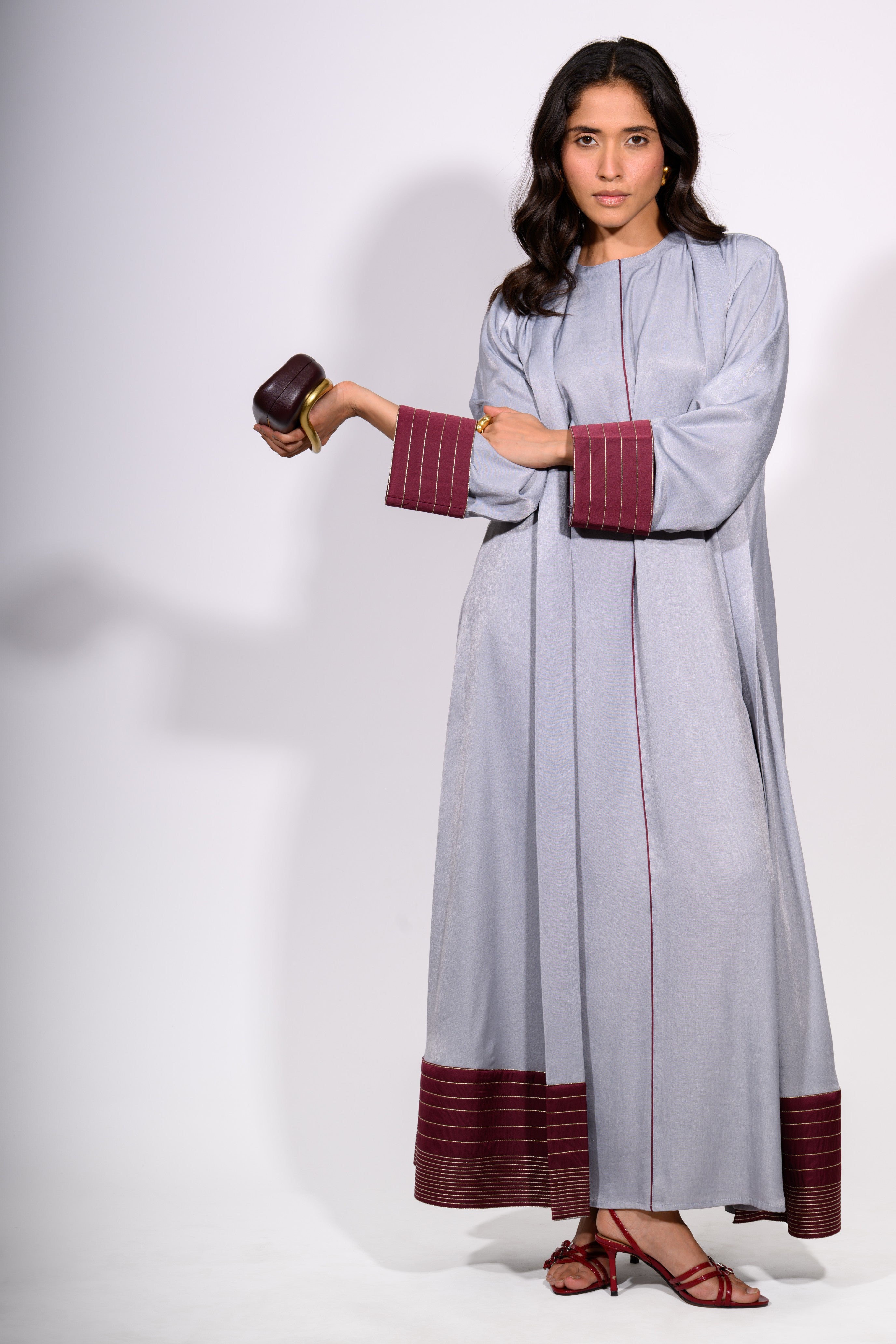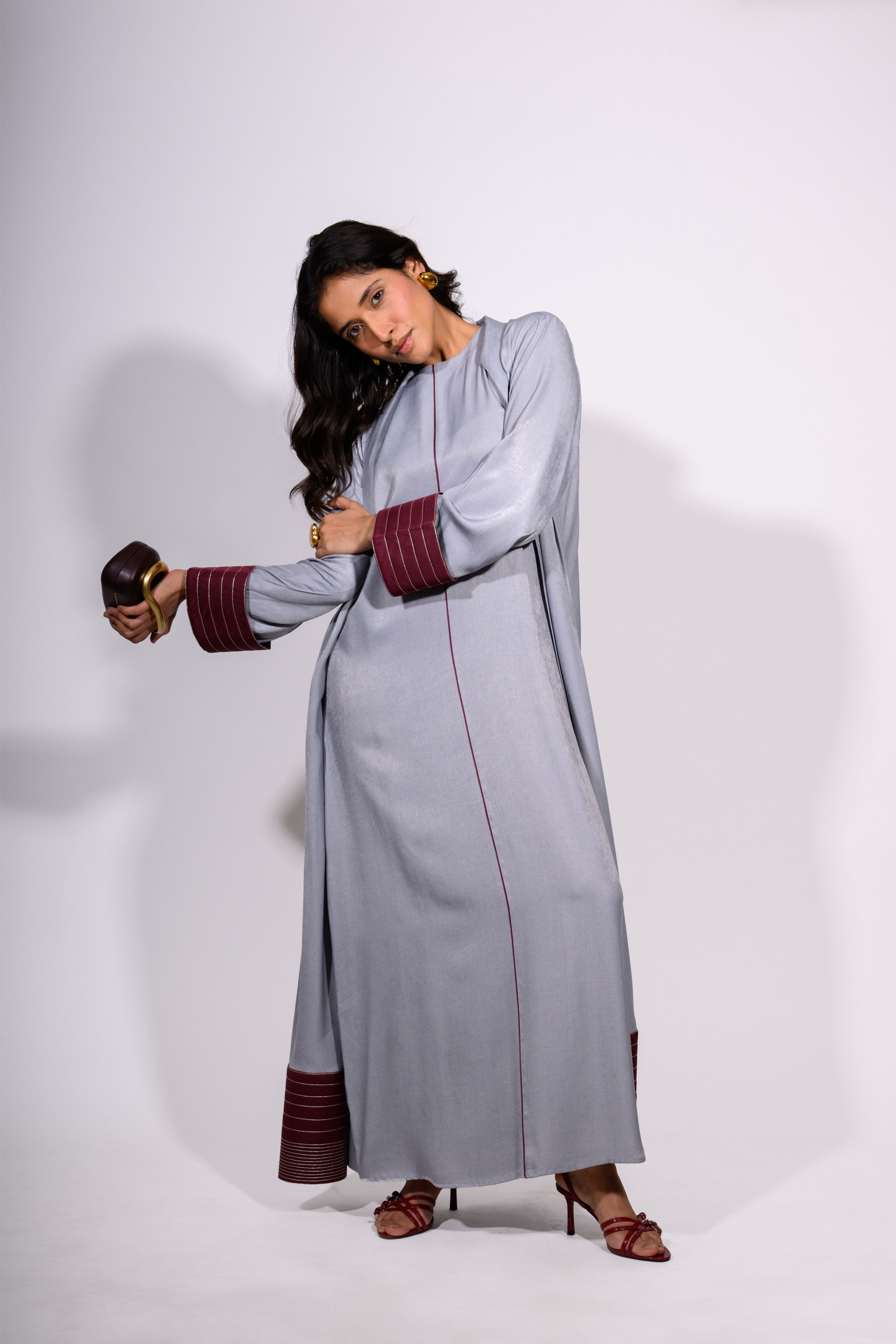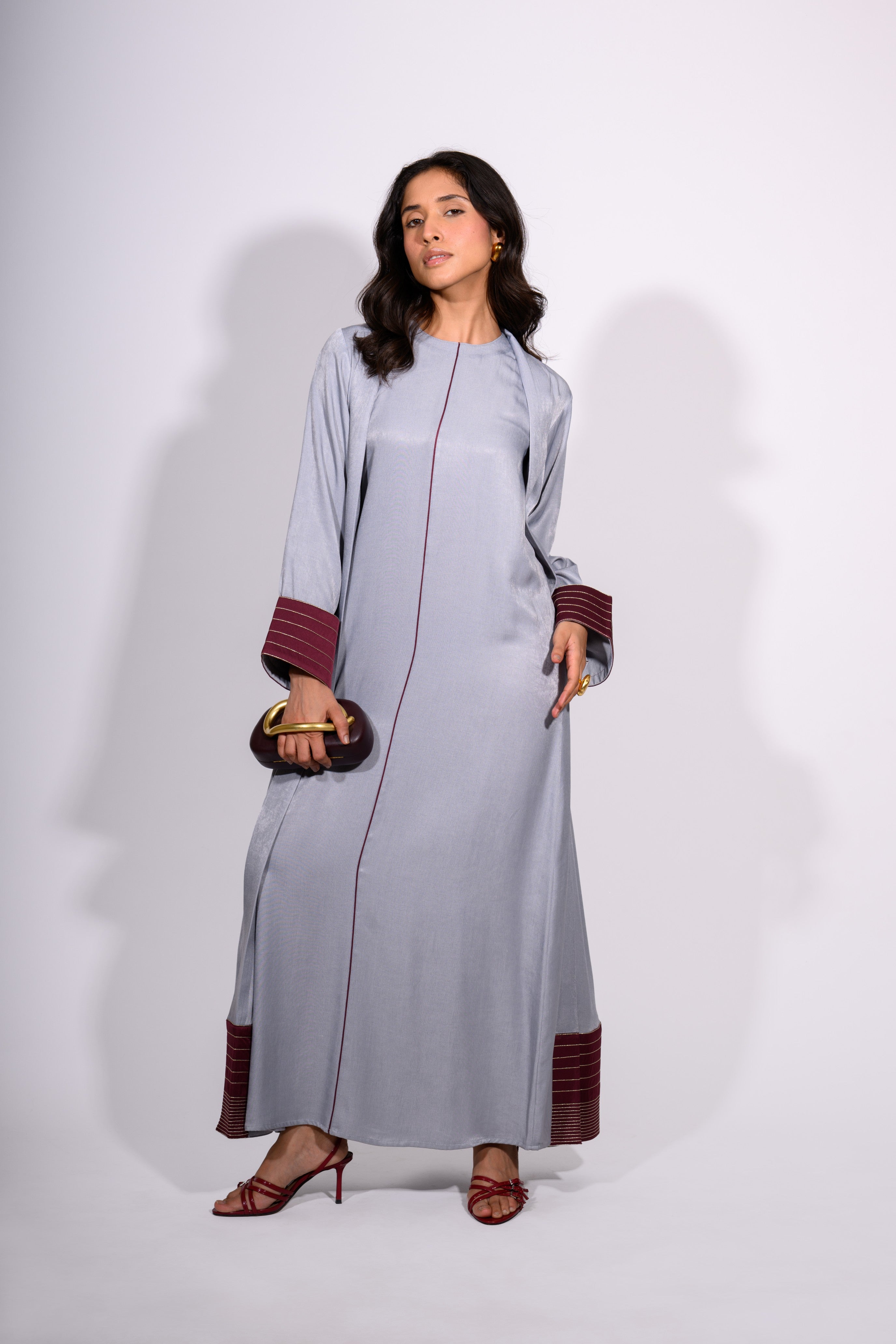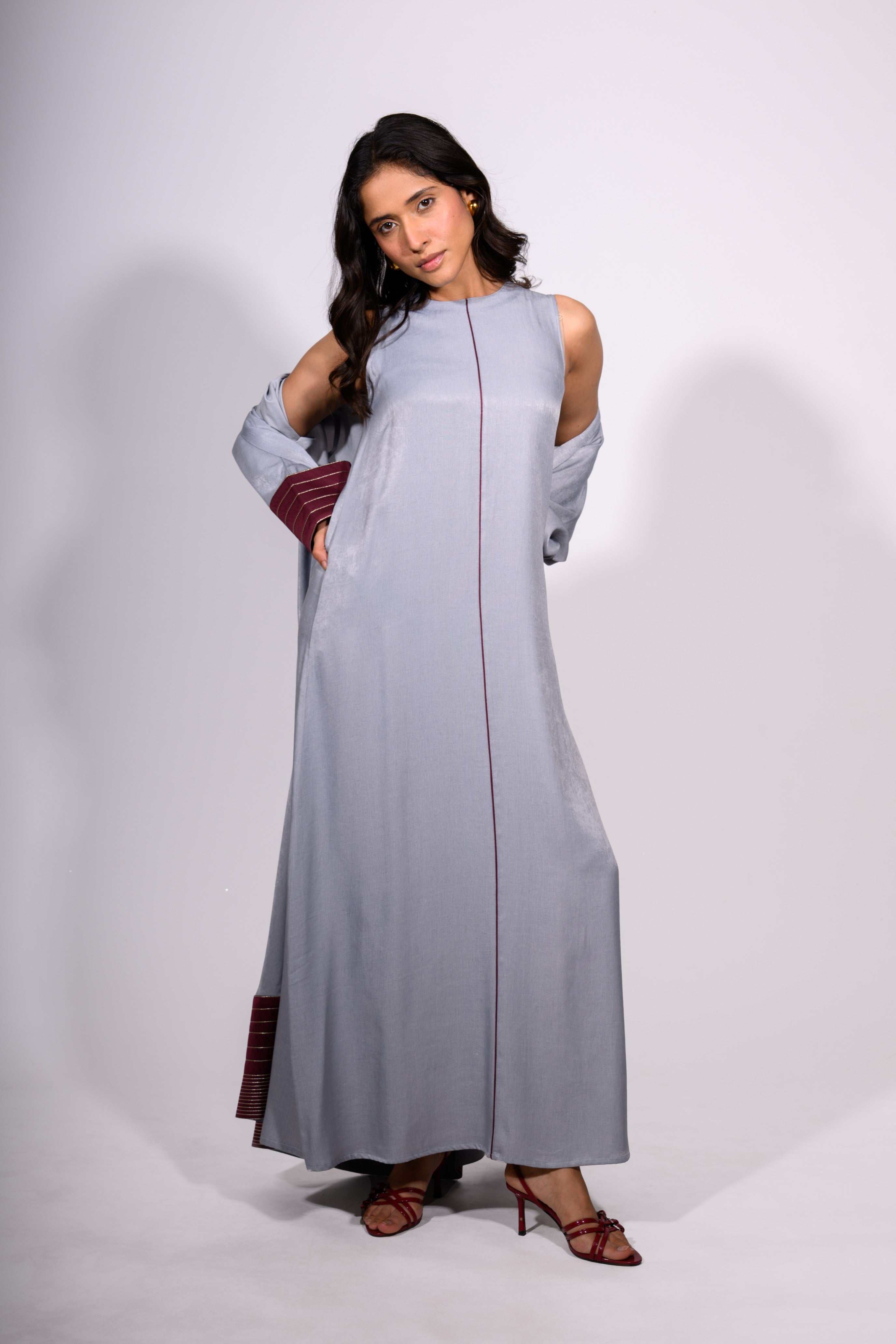 The Steel Serenity Set is a harmonious blend of modern elegance and relaxed grace. This floor-length ensemble features a soft, steel-blue tunic dress with a minimalist silhouette, subtly defined by a single maroon contrast stitch running vertically down the center. The accompanying overlay jacket mirrors the dress’s hue while introducing rich maroon accents at the cuffs and hem—enhanced with fine stripe detailing for texture and depth.