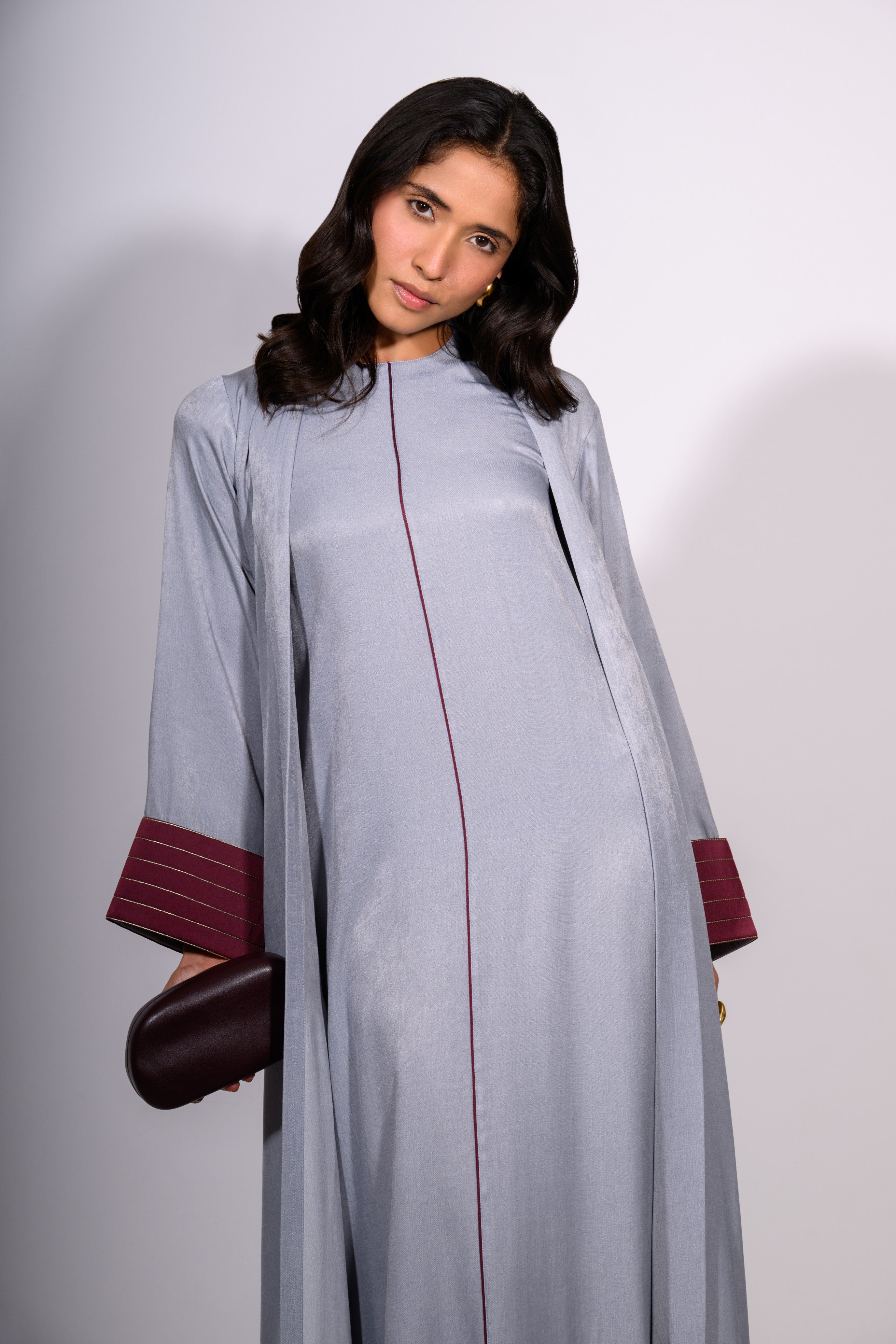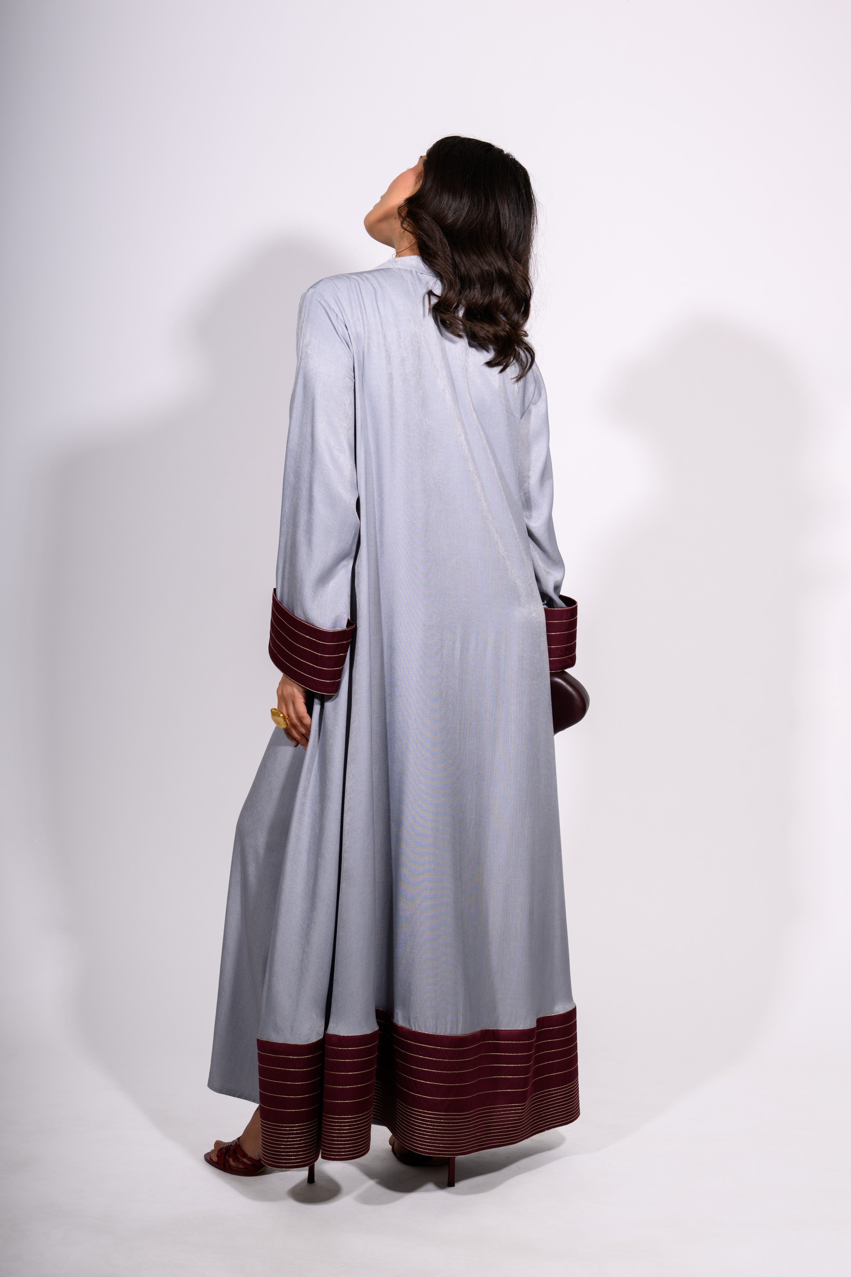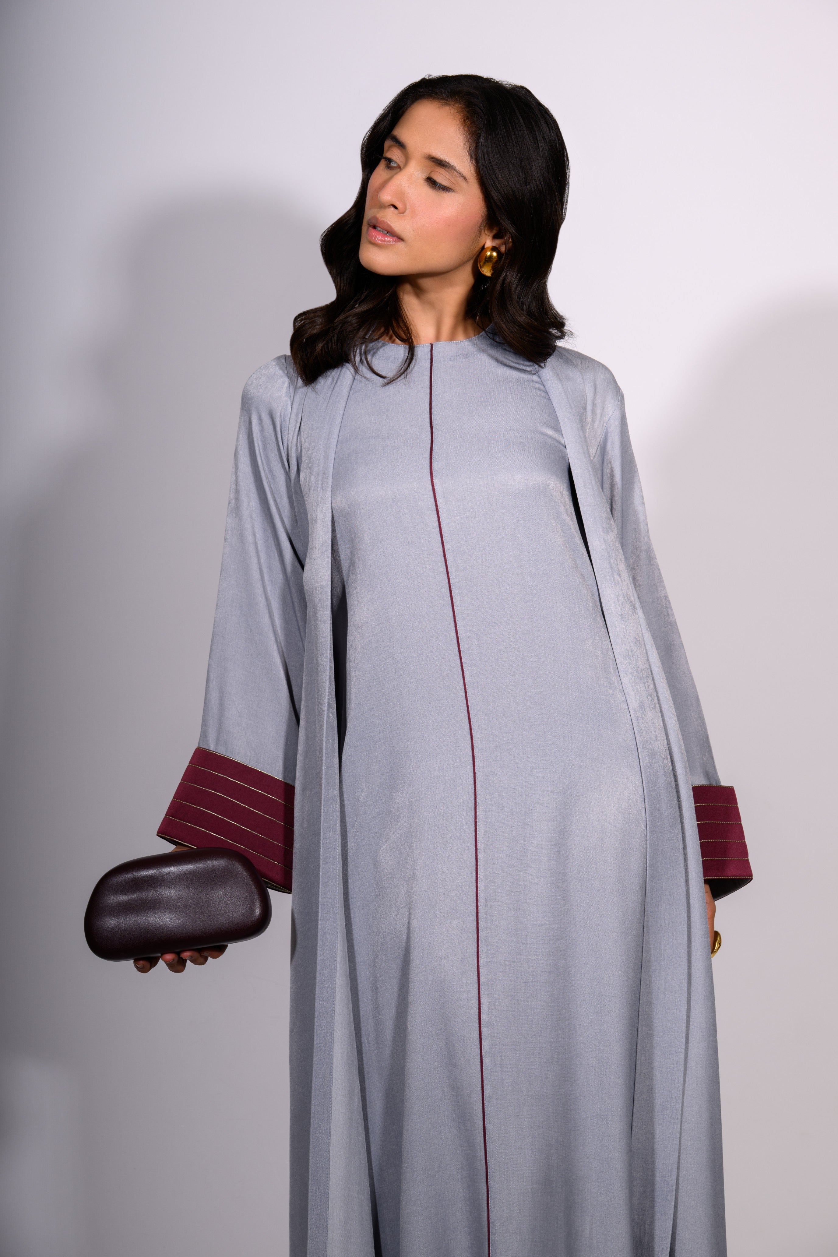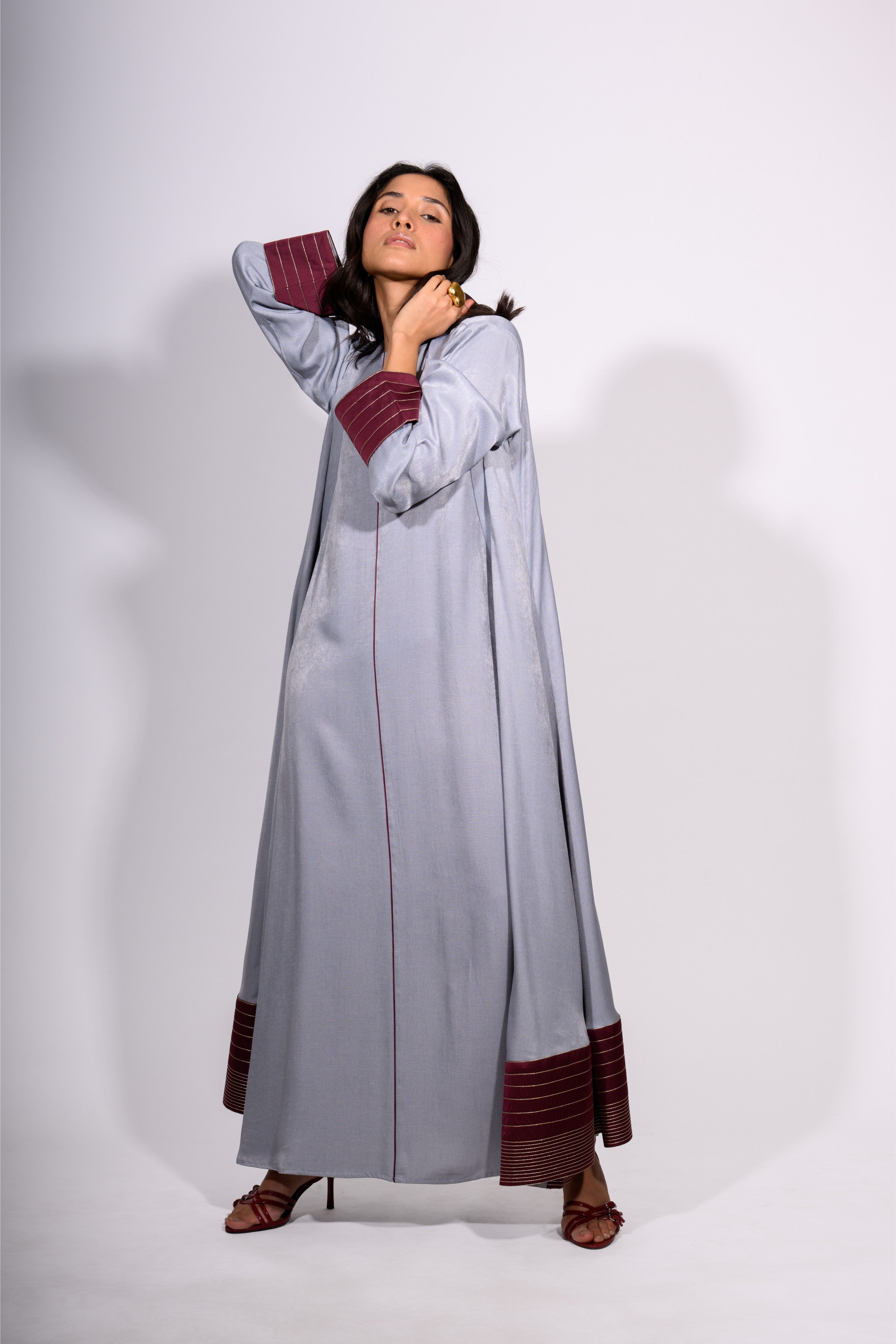 The Steel Serenity Set is a harmonious blend of modern elegance and relaxed grace. This floor-length ensemble features a soft, steel-blue tunic dress with a minimalist silhouette, subtly defined by a single maroon contrast stitch running vertically down the center. The accompanying overlay jacket mirrors the dress’s hue while introducing rich maroon accents at the cuffs and hem—enhanced with fine stripe detailing for texture and depth.
