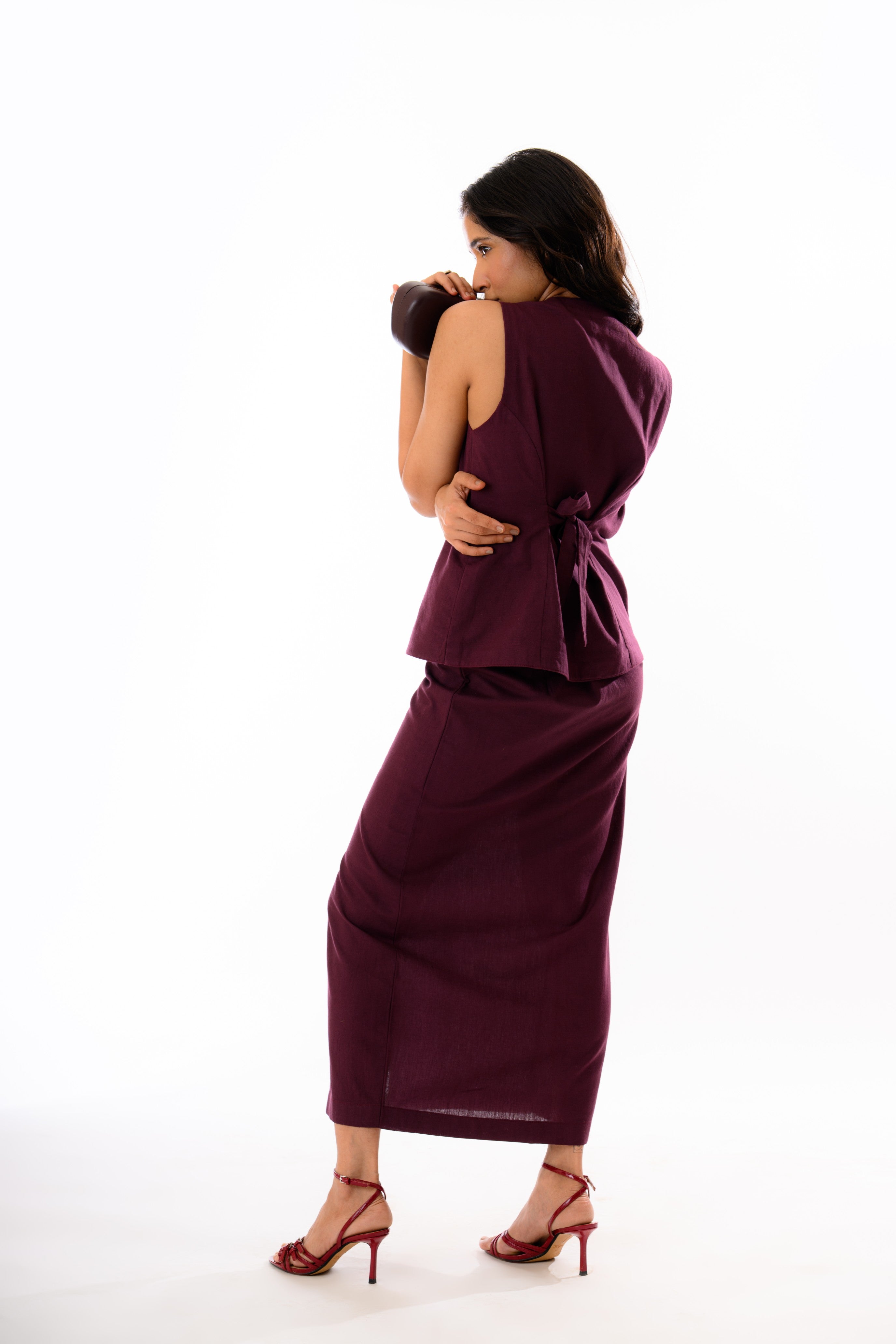 Refined, minimal, and powerfully feminine—The Claret Curve Set is designed to make a subtle yet striking statement. Tailored in a rich plum hue, this two-piece ensemble features a sleeveless, high-neck top with a sculpted silhouette, curved hem, and cloth-covered buttons that lend a touch of vintage sophistication.