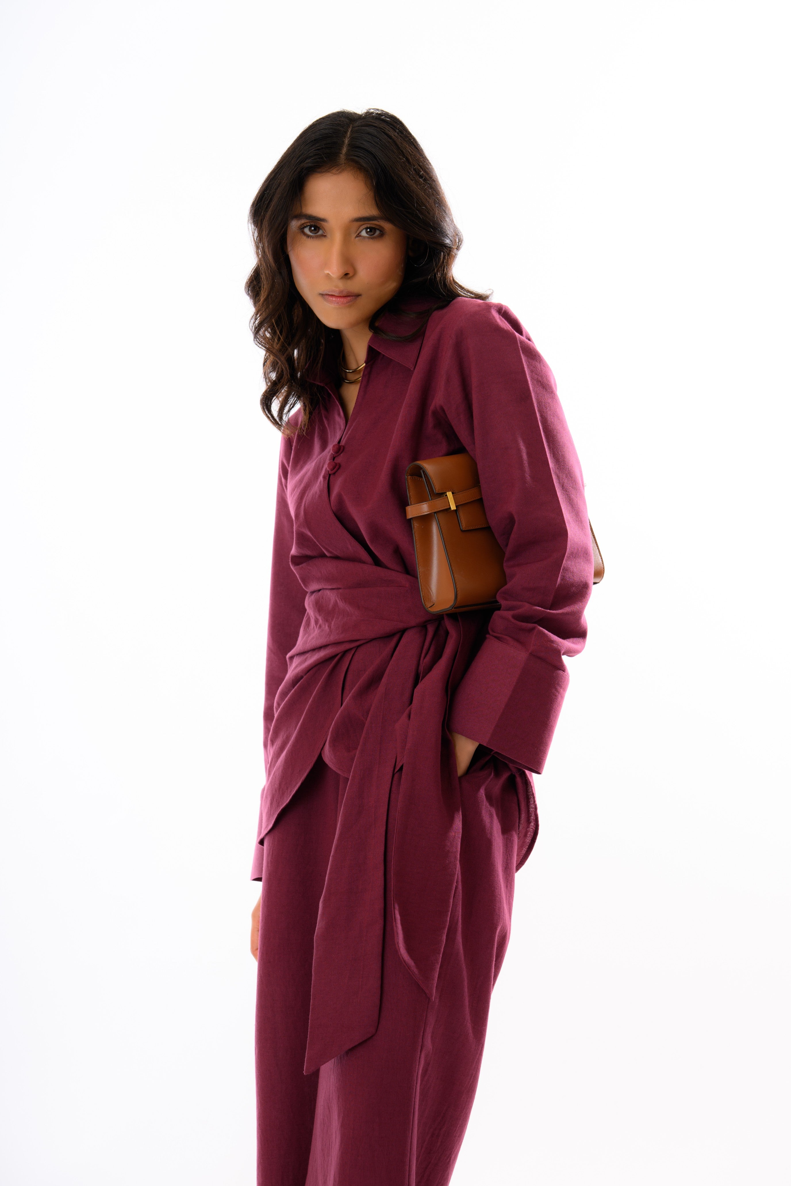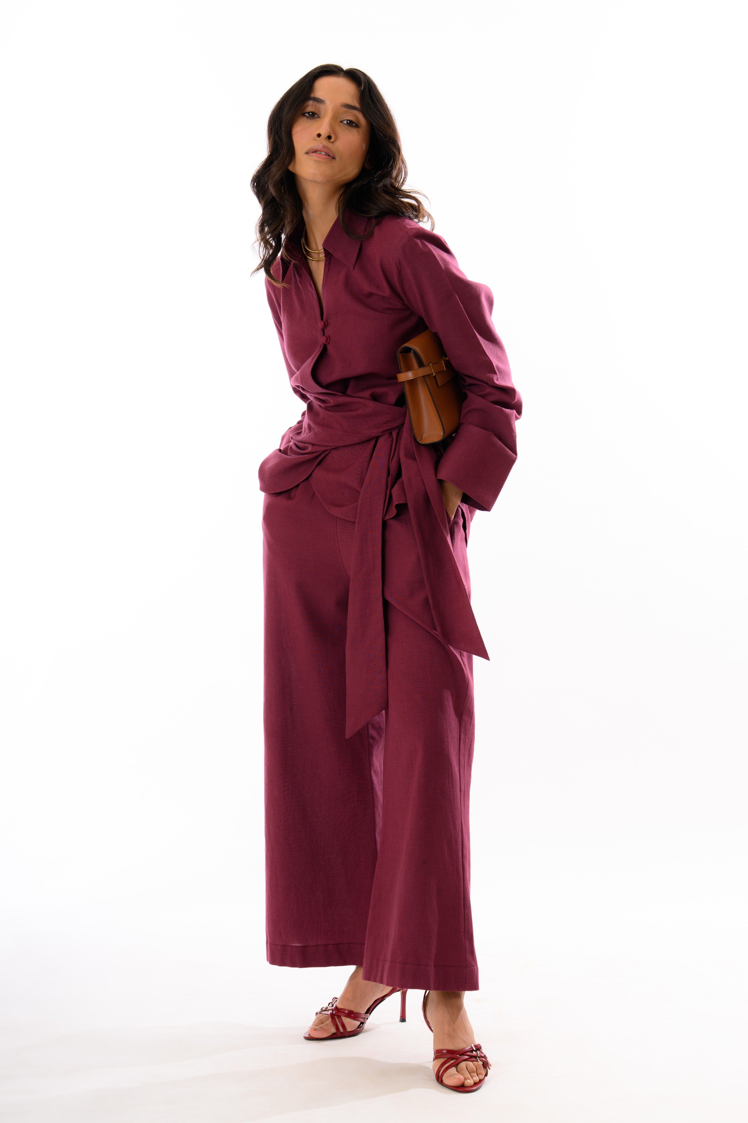 This effortlessly elegant co-ord set in a deep maroon cotton linen blend features a wrap-style shirt and wide-leg trousers, blending comfort with contemporary tailoring. The shirt has a structured collar and buttoned front, with an exaggerated wrap tie that cinches at the waist, adding graceful definition and movement to the silhouette. Long, relaxed sleeves lend it a soft, flowing drape.