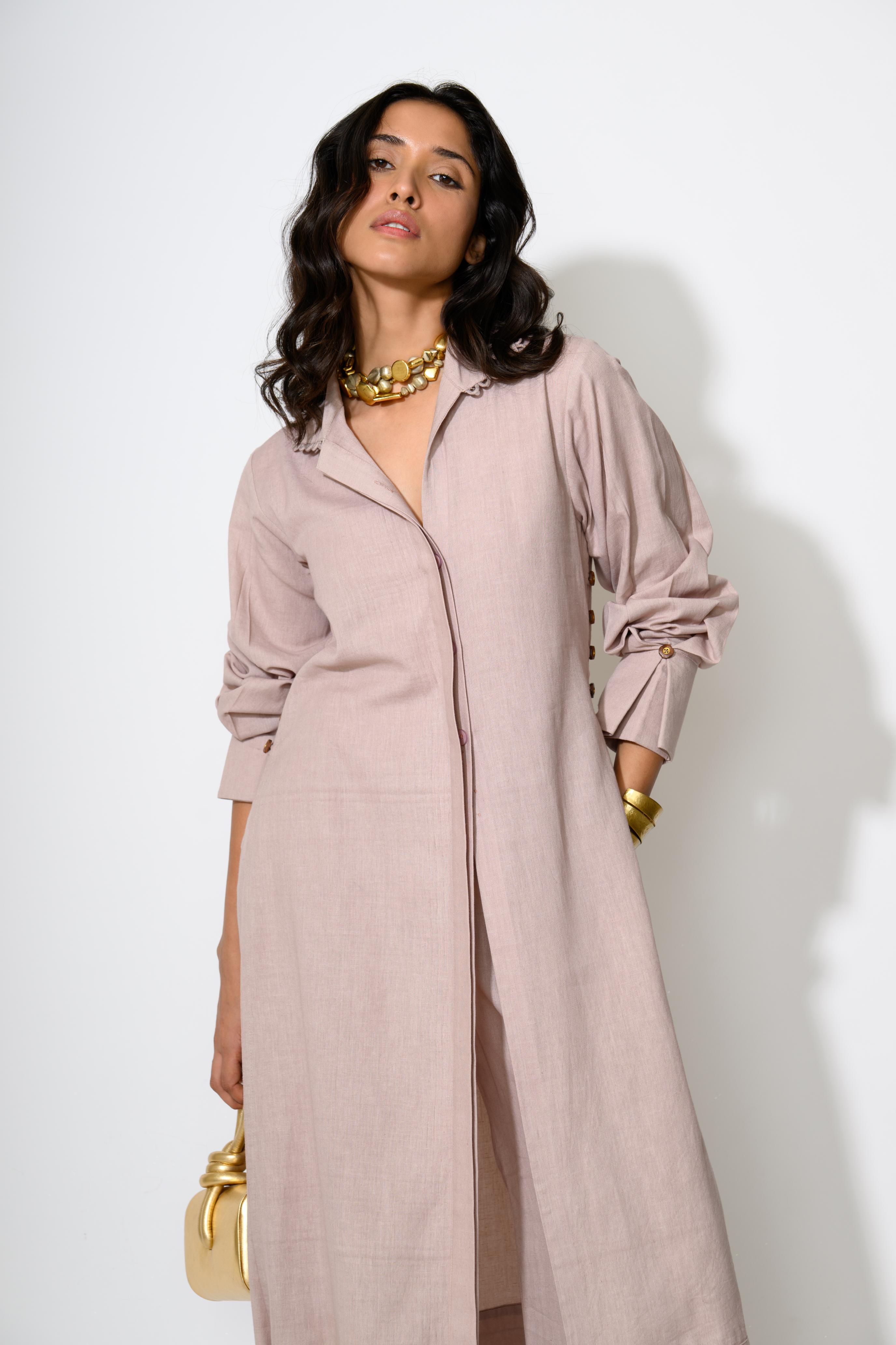 Elevate your everyday wardrobe with the understated elegance of the Rose Dusk Co-ord Set. Crafted from a breathable, lightweight fabric in a muted tone, this ensemble features a long, button-down kurta with a crisp collar and pleated panel detailing at the hem. The relaxed-fit kurta is paired with matching wide-legged trousers for a refined yet comfortable silhouette. Ideal for transitional dressing, this set embodies relaxed sophistication.