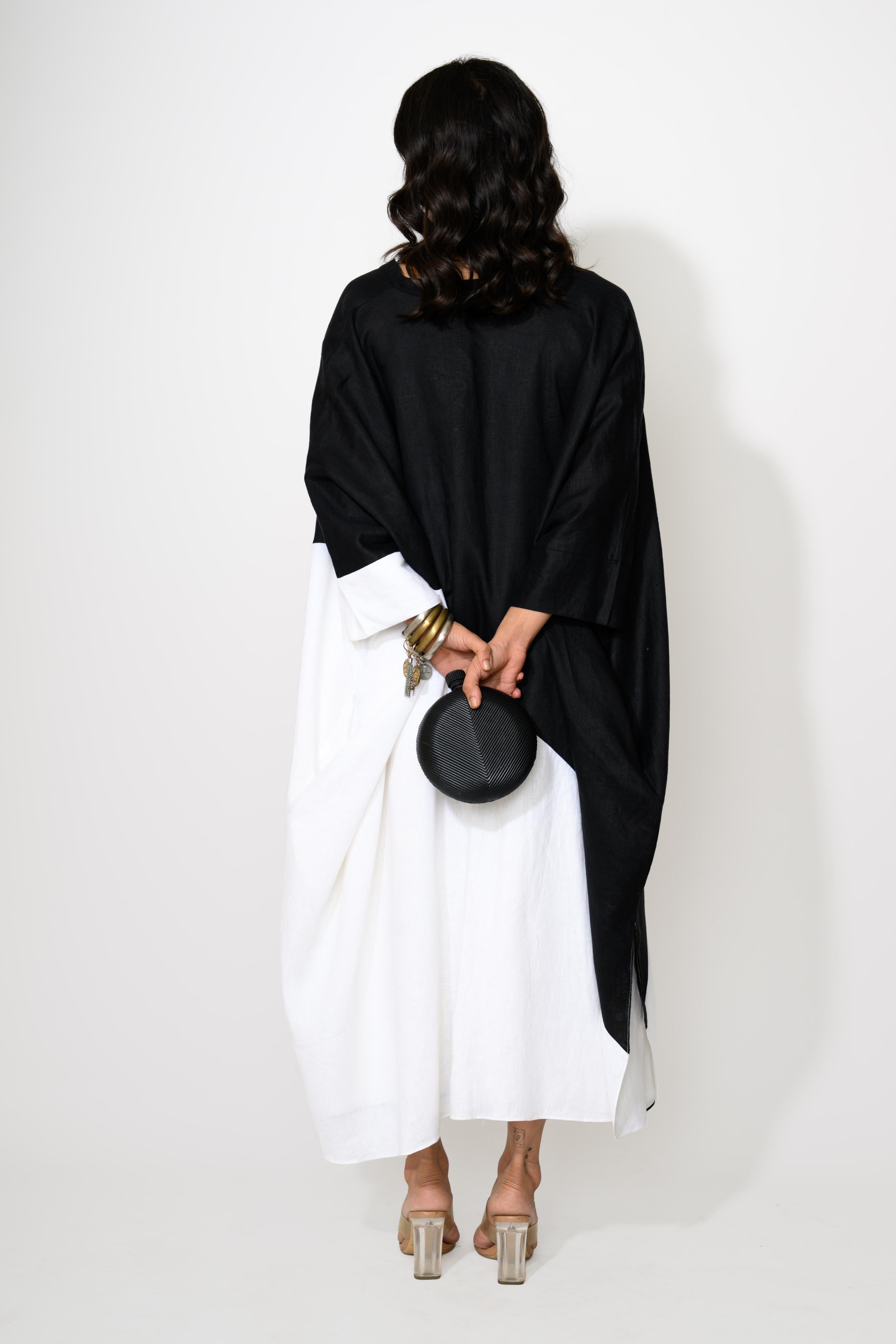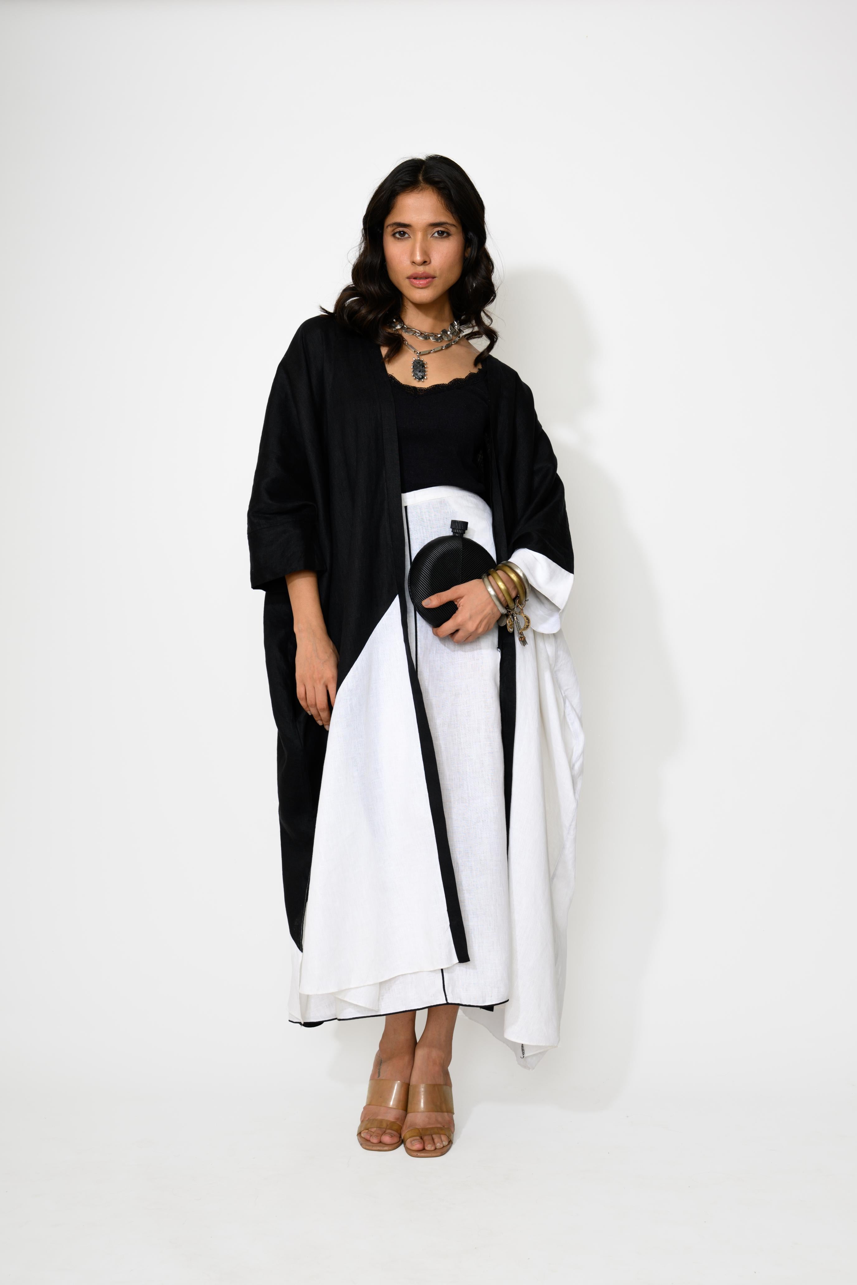 A bold statement in black and white, the Monochrome Flow Co-ord Set is a 3-piece ensemble that exudes contemporary elegance with a touch of minimalism. It features a soft black camisole top , paired with a structured white skirt detailed with sleek black piping that lends a clean, linear aesthetic. The look is elevated with an oversized, asymmetrical shrug in a striking black-and-white panel design that flows effortlessly with every movement. Designed for comfort and visual drama, this set makes an ideal pick for art gatherings, luxe resorts, or cultural evenings.