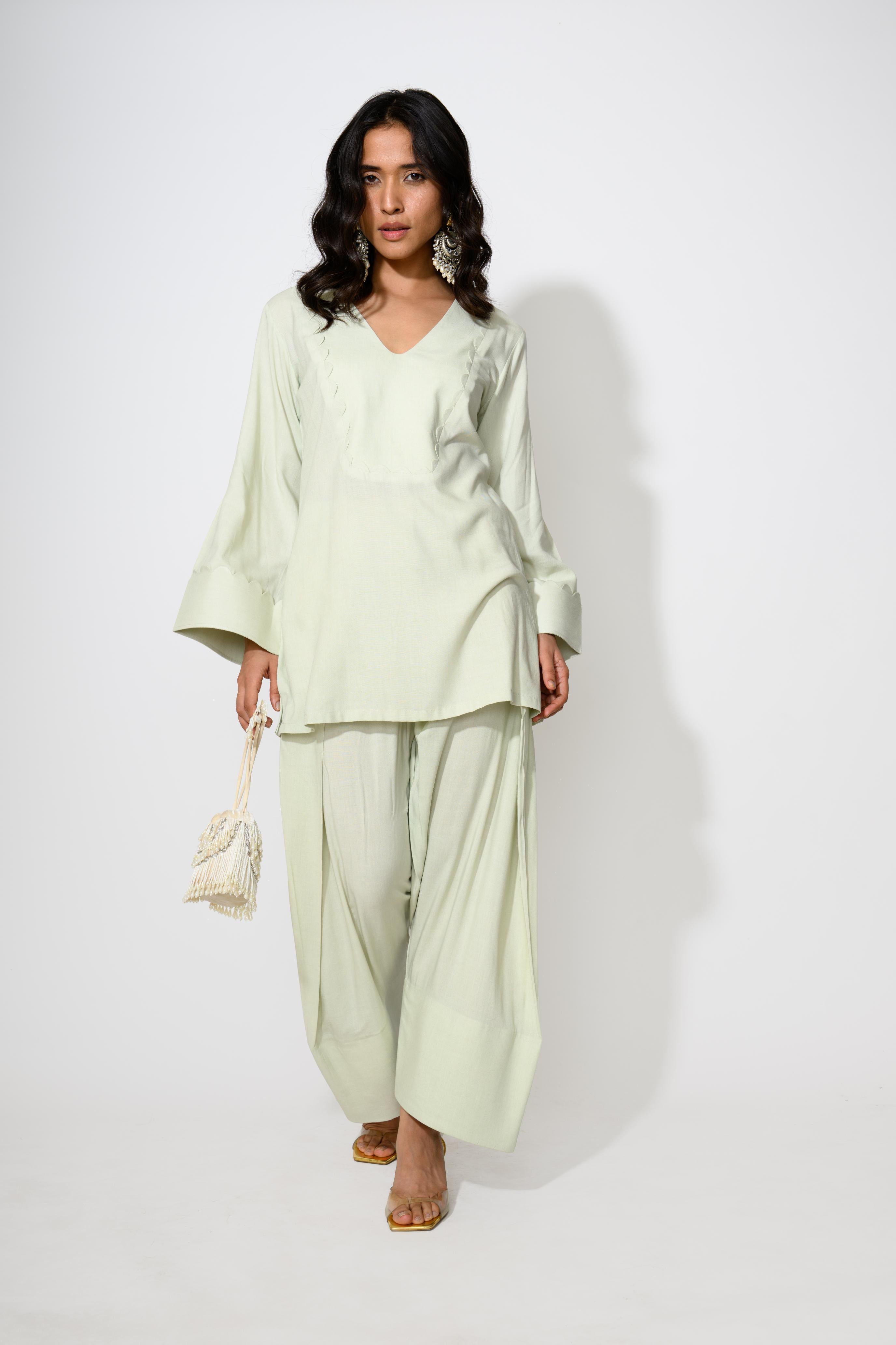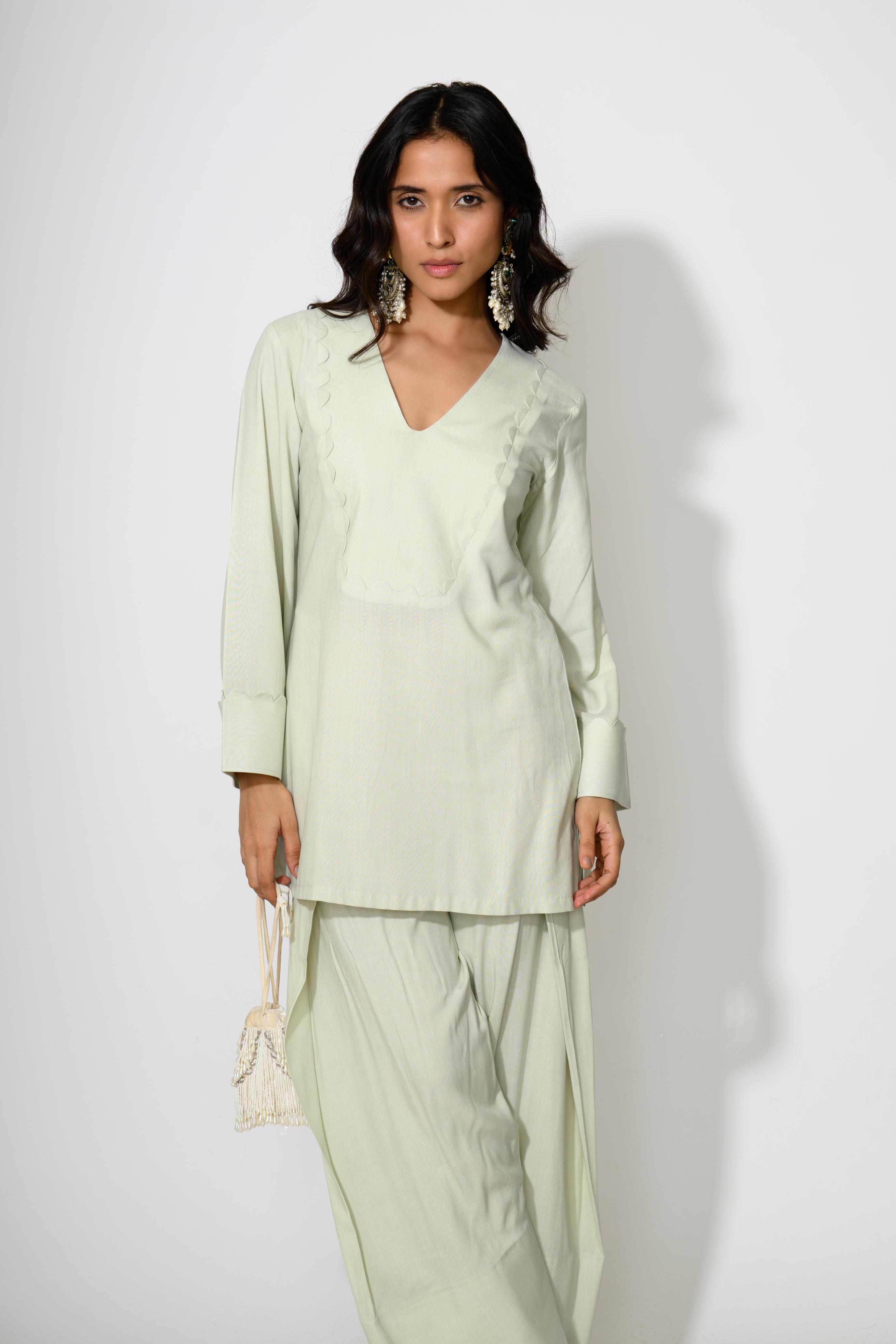 Understated yet elegant, the Mint Scallop Kurta Set is a breezy pastel mint Indo Western set. The kurta features a flattering V-neckline accentuated with delicate scallop-edge detailing. Paired with relaxed-fit Pakistani trousers, this set blends comfort with quiet sophistication.